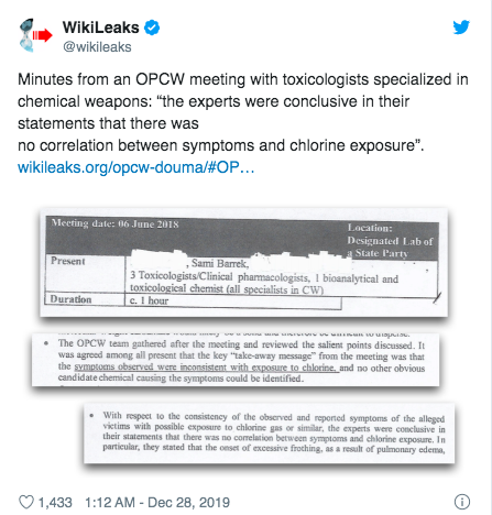 Like all the other many, many, many, many different leaks which have been hemorrhaging from the OPCW about the Douma incident, none of the important information contained in these publications was included in any of the OPCW's public reports on the matter. According to the OPCW's Final Report published in March 2019, the investigative team found “reasonable grounds that the use of a toxic chemical as a weapon took place. This toxic chemical contained reactive chlorine. The toxic chemical was likely molecular chlorine.”