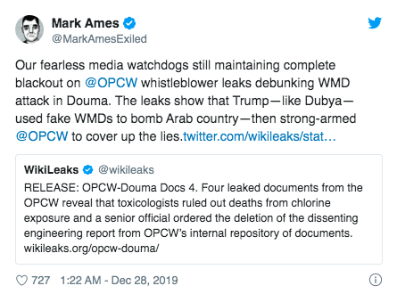 "Our fearless media watchdogs still maintaining complete blackout on OPCW whistleblower leaks debunking WMD attack in Douma. The leaks show that Trump—like Dubya— used fake WMDs to bomb Arab country—then strong-armed OPCW to cover up the lies," tweeted journalist Mark Ames.