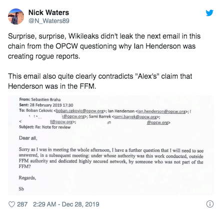 Bellingcat narrative jockeys such as "senior investigator" Nick Waters are already scrambling to perception manage everyone into believing their own eyes are lying to them. Waters has a thread on Twitter that's being shared around by all the usual Syria spinmeisters claiming, based on no evidence whatsoever, that WikiLeaks is selectively publishing the documents it has to create a false impression of events in the OPCW. Waters falsely claims that an email by Sebastien "Voldemort" Braha — the guy at the center of the scandal — proves that Ian Henderson was not a part of the Fact-Finding Mission (FFM) in Douma, in contradiction to the claims made by the anonymous second OPCW whistleblower who goes by the pseudonym of "Alex".