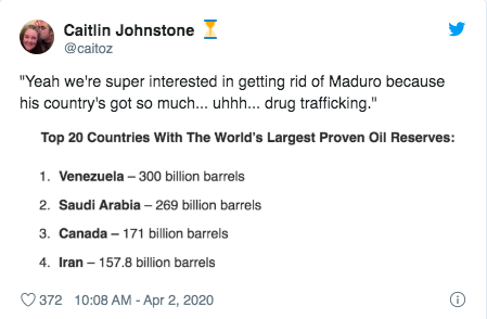 The Trump administration has already admitted that its sole interest is in toppling the Venezuelan government with its ridiculous offer to cease murdering civilians via economic warfare if Maduro leaves office; adding a bunch of unrelated gibberish about narco-trafficking on top of this does nothing to obfuscate this. Warships have been sent to Venezuela because the Trump administration is waging a deadly war upon Venezuelans and that's what you do during a war. These continued escalations are directed at nothing other than shoring up more power and control for the globe-spanning US-centralized empire, which works tirelessly to dominate the world by dominating its resources.