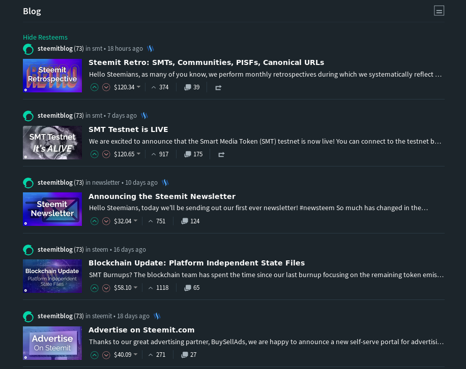 The following screenshot is from the last 5 posts on the @steemitblog