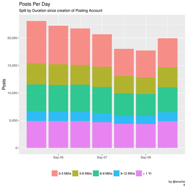 Seems to me like the older accounts are the ones doing the most posting, probably the same guys who had over one year posting last year are doing the same this year and what we don't have are new active users. Also going down from close to 20k a day to 6k a day is kind of worrying I think.