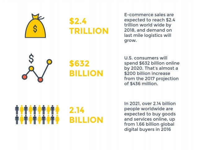 E-commerce this year can reach a huge figure of 2.4 trillion dollars, which will further increase the demand for logistics. It is expected that US consumers are projected to spend 632 billion dollars before 2020, which is $ 200 billion higher than the figures for 2017. It is also planned to grow online consumers and 1.66 billion to 2.14 billion users.
