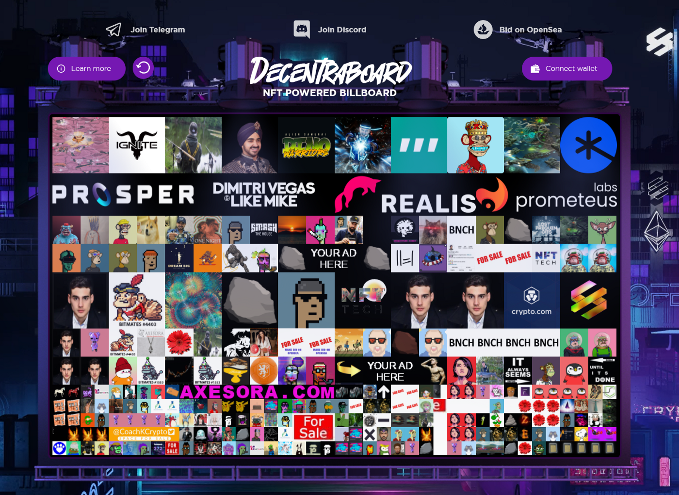 Furthermore, DECENTRABOARD is the centerpiece of the extraordinary 'Avalon' artwork. By claiming your spot on the billboard you'll be able to showcase your brand, company or gimmick in the digital and maybe even further…