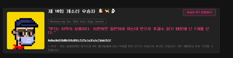 오늘 소개해드릴 NFT 프로젝트는 도지사운드클럽이라는 곳입니다. 도지사운드클럽? 개소리동아리? 맞습니다! 이곳은 개소리를 하기위해 만들어졌습니다. 각자의 개소리를 진심을 다해 작성해서 올리면 가장 많은 투표를 받은 사람이 우승을 하게 됩니다. 우승을 하면 해당 개소리를 nft로 만들어서 보유할 수 있게 됩니다. 많은 메이트가 참여하는 만큼 우승하기 어렵습니다. 그만큼 의미있겠죠?