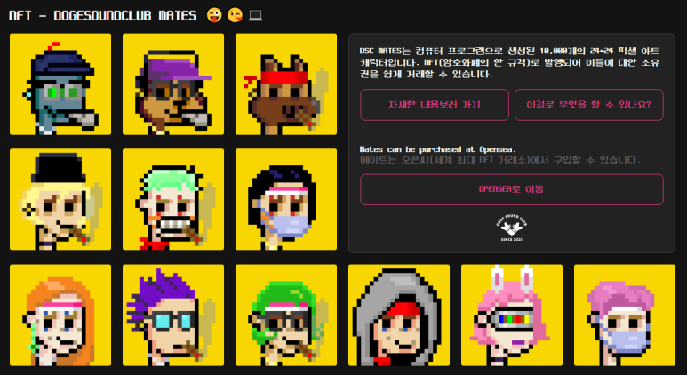 제너레이티브로 만들어진 이 NFT는 24*24 픽셀 아트로 구성되어있습니다. 임용진 작가님의 손으로 탄생하였습니다. 저마다의 독특한 개성을 가지고 있으며 국내최초 NFT라는 상징성을 지닙니다. 또한, 풀온체인으로 제작되어있어, 외부에 이미지를 저장하여 수정이 가능한 IPFS 방식과는 달리 클레이튼 자체에 그림 및 메타데이터가 저장되어 있는 특징을 지니고 있습니다. 도지사운드클럽 운영진의 기술력을 엿볼 수 있습니다. 메이트는 ONLY 10,000개만 제작되었습니다. 메이트는 상업적, 2차창작이 가능합니다. 본인의 메이트로 무궁무진한 활동을 하실 수 있습니다.