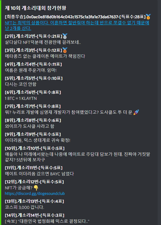 저도 개소리 대회에 참여했습니다만....아쉽게 탈락의 고배를 마시게되었다는... 1위의 개소리는 무려 28표를 받아 당당히 당선되었습니다. 축하드립니다!