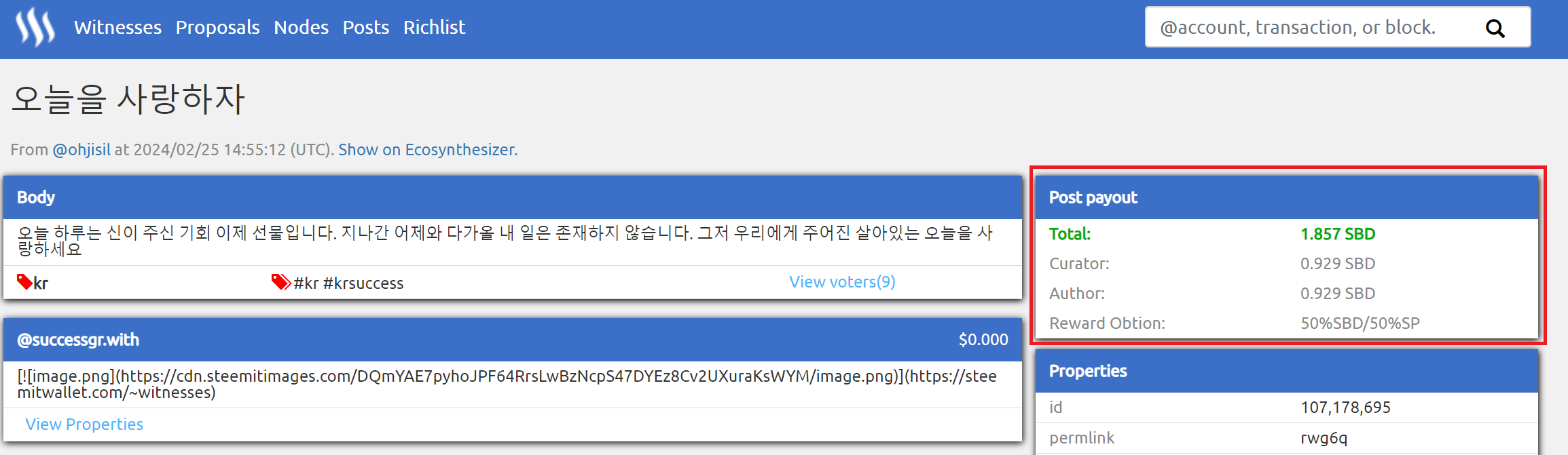 Nixiee의 블록체인 데이터는 정상적으로 Upvote를 한 기록과 보상이 표시되고 있지만