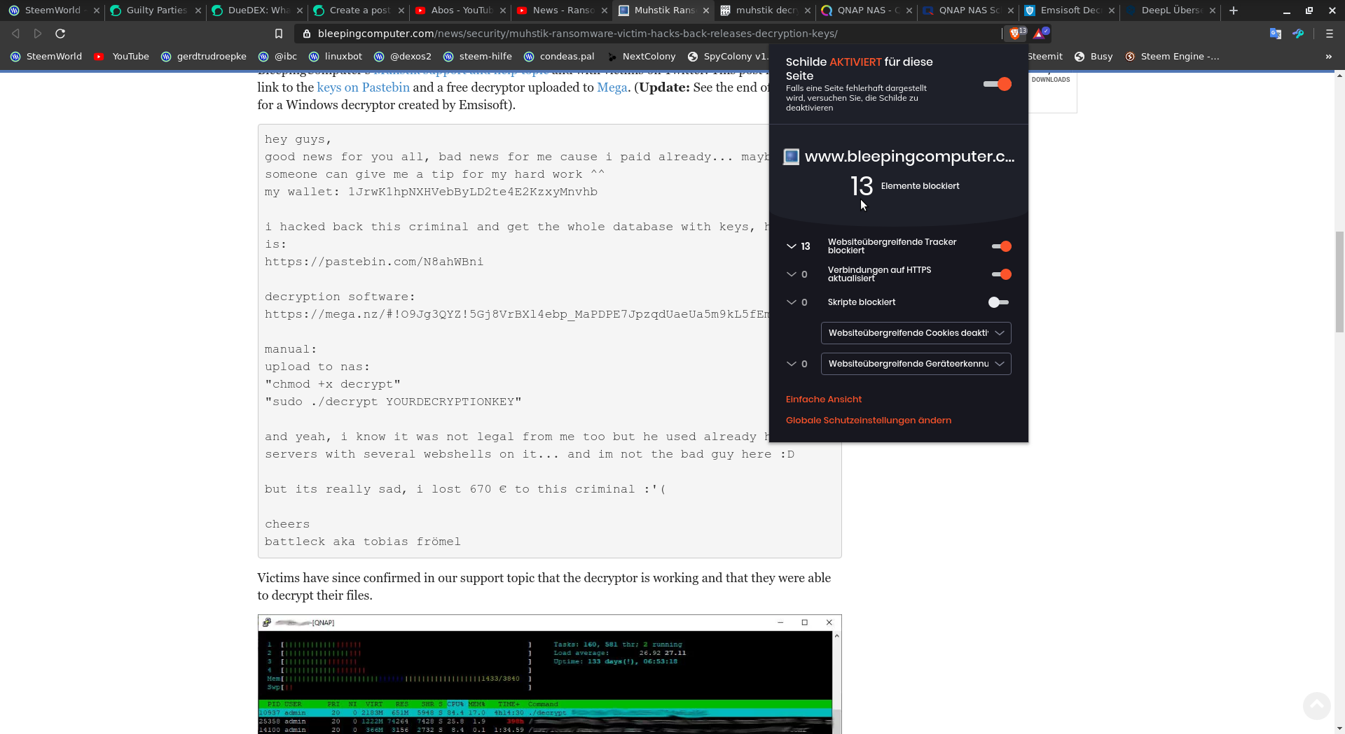 Zum Beispiel die Seite https://www.bleepingcomputer.com/news/security/muhstik-ransomware-victim-hacks-back-releases-decryption-keys/ verbirgt 13 Webseiten übergreifende Tracker