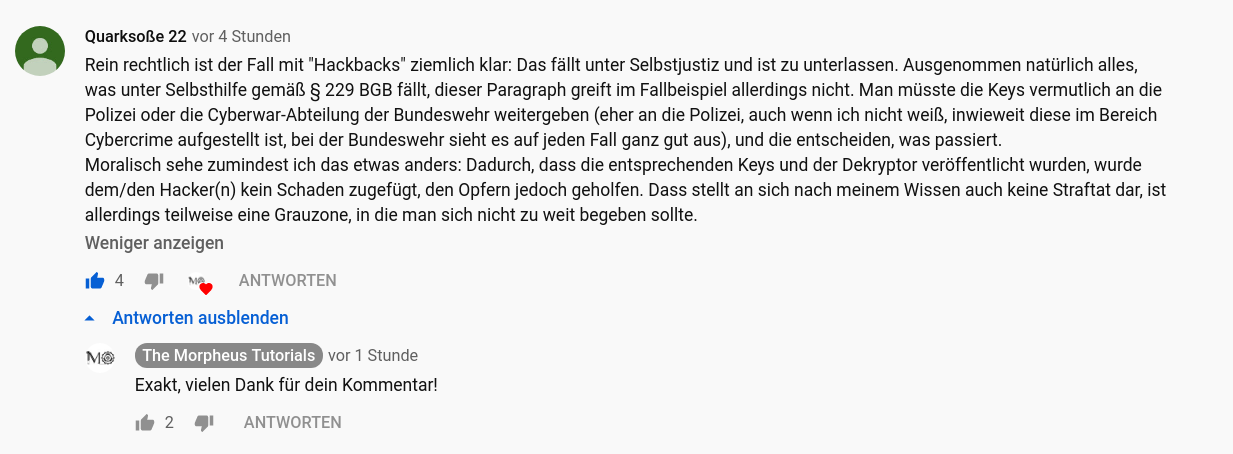 ...Rein rechtlich ist der Fall mit "Hackbacks" ziemlich klar: Das fällt unter Selbstjustiz und ist zu unterlassen. Ausgenommen natürlich alles, was unter Selbsthilfe gemäß § 229 BGB fällt...