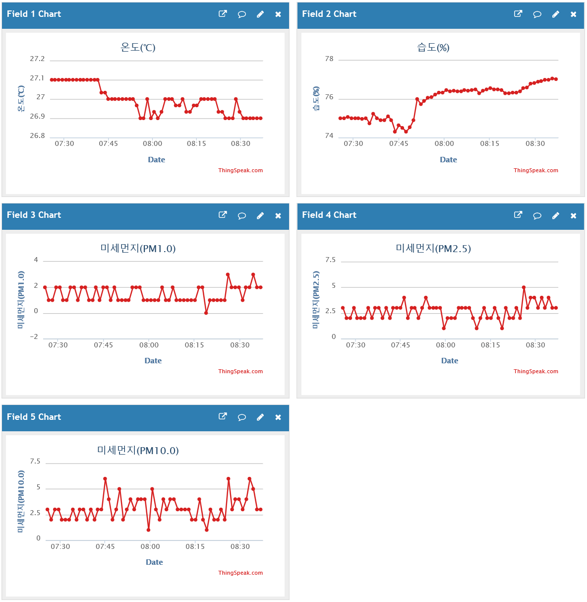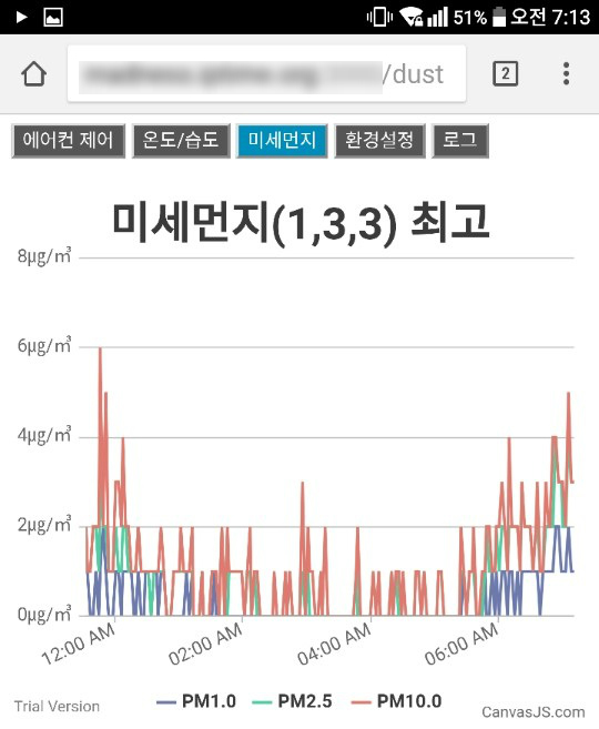 ↑ 실내 미세먼지는 PMS7003 센서로 계측합니다. PM1.0, PM2.5, PM10.0 각각 차트로 출력합니다. 차트 제목 우측의 미세먼지 수준에 대한 설명은 미세미세 모바일 앱의 기준을 적용했습니다. 추후 MP3 재생 모듈을 이용하여 미세먼지 수치를 음성으로 안내 할 계획입니다.