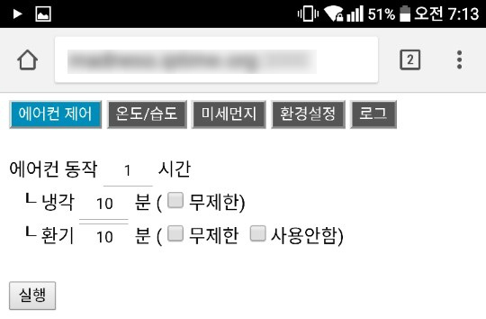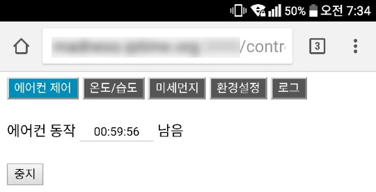 ↑ 에어컨 운영이 시작되면 남은 시간을 출력하고 수동으로 중지할 수 있습니다. 추후 비동기 통신을 하여 시간만 갱신할 계획입니다.