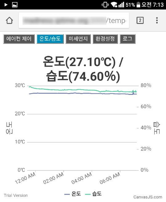 ↑ 실내 온도 및 습도는 DHT22 센서로 계측합니다. 차트 제목의 값은 마지막 계측한 것입니다.