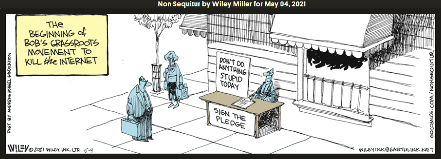 The comic Non Sequitur can be funny. Sign the pledge, "Don't do anything stupid today" which will kill the internet. Should have "post" or "say" instead of "do"