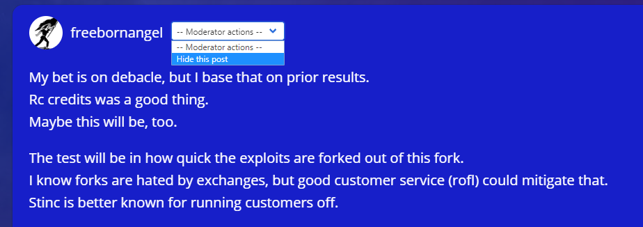 That prevarication on the part of downvote pool promoters is one of the strongest reasons I suspect increased censorship is a core reason for the proposal. Honest people would acknowledge and discuss it amongst the pros and cons. This is an indication of the nature of the proponents of HF21, and is a good reason to be very skeptical about the rhetoric they use.