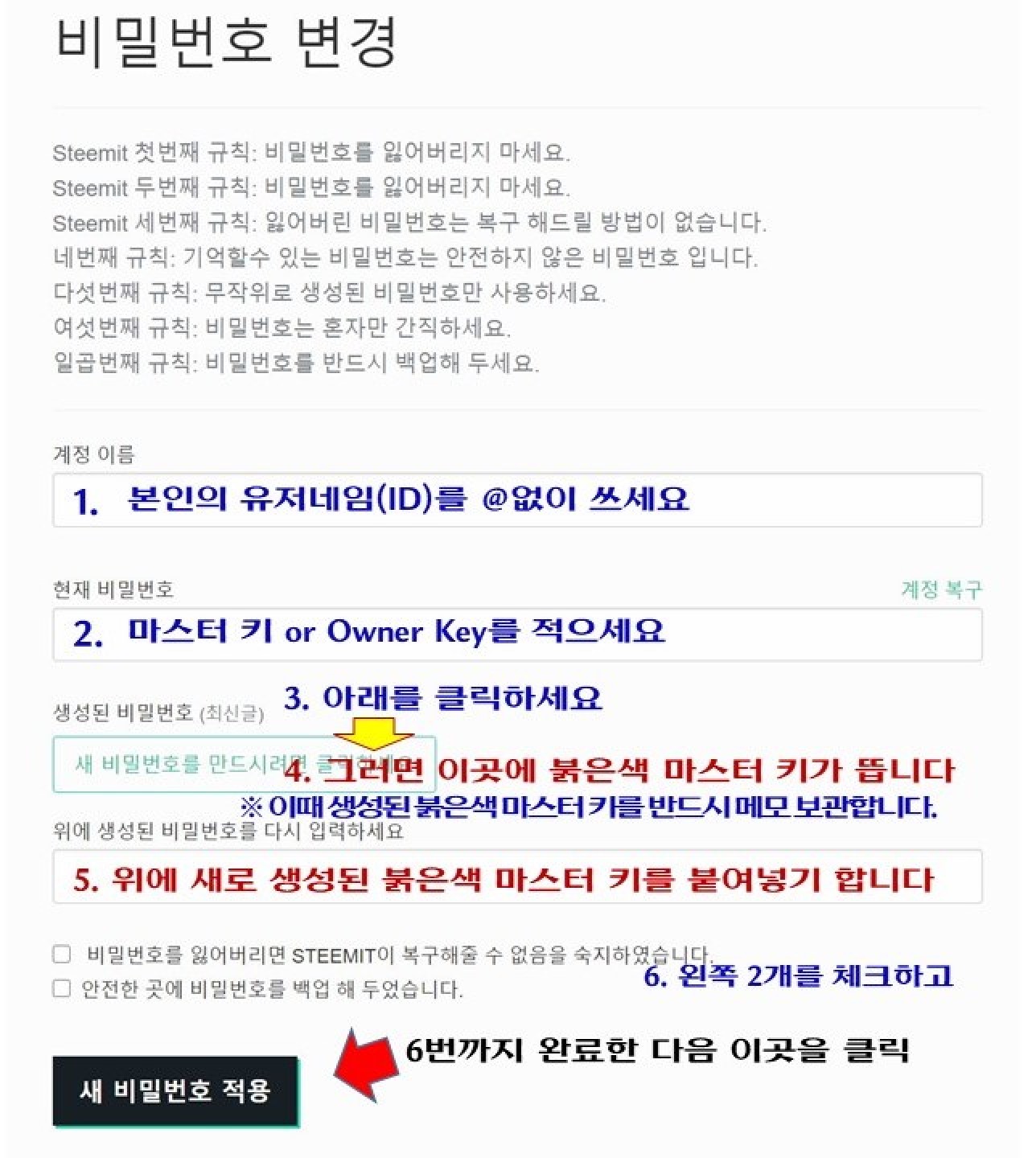 5. 새 마스터 키를 잃어버리면 steemit를 복구할 수 없다는 것과 새 마스터 키를 백업해 두었다는 확인란 2곳을 체크해 준 다음,