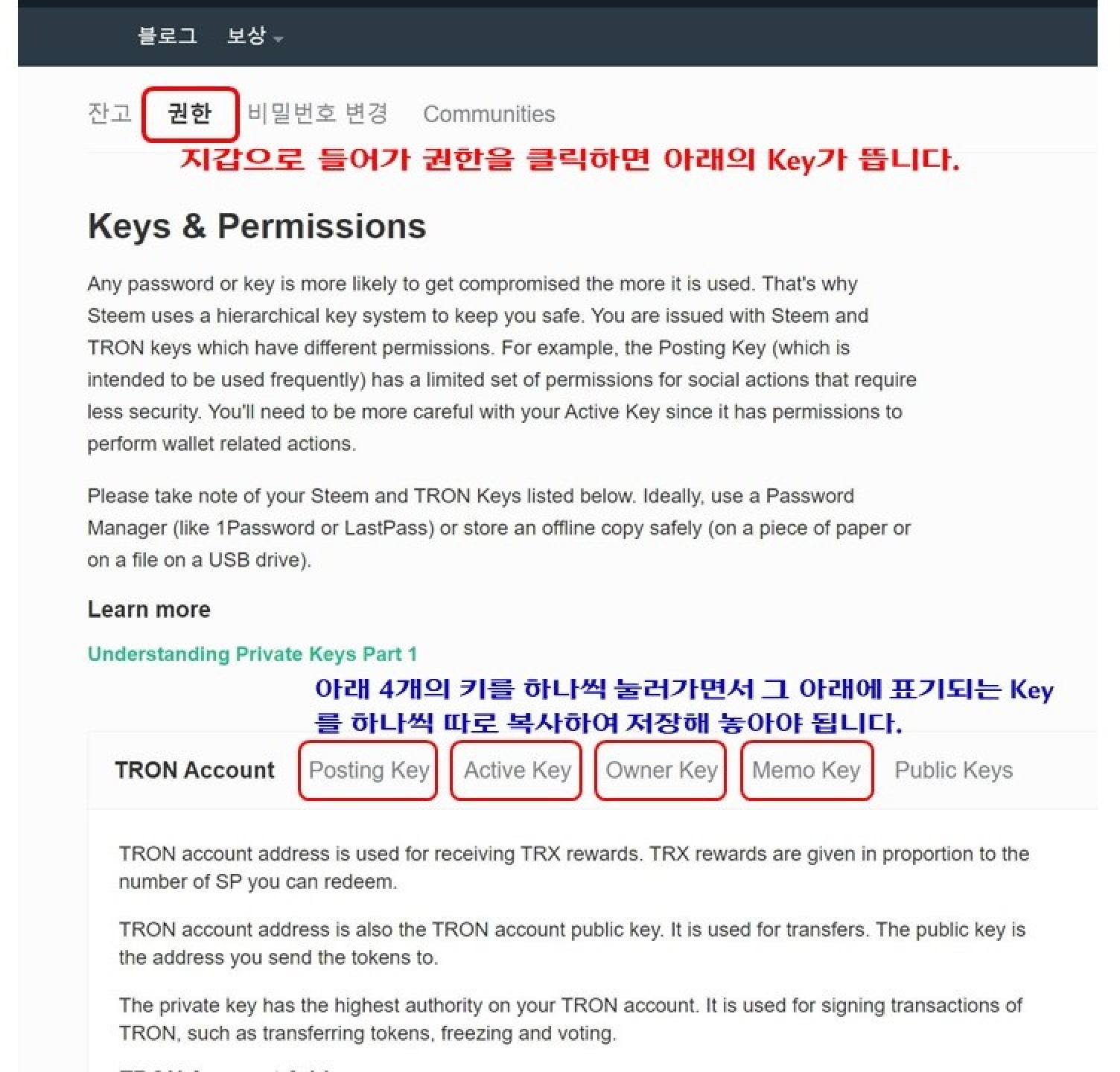 스팀잇 지갑의 권한 버튼을 누르게 되면 4개의 Key가 뜨게 됩니다. 이때 4개 버튼의 키를 하나씩 순서대로 눌러가며 아래에 길게 표시되는 각각의 Key를 새로 생성된 마스터 키와 함께 별도로 잘 보관해 둡니다.