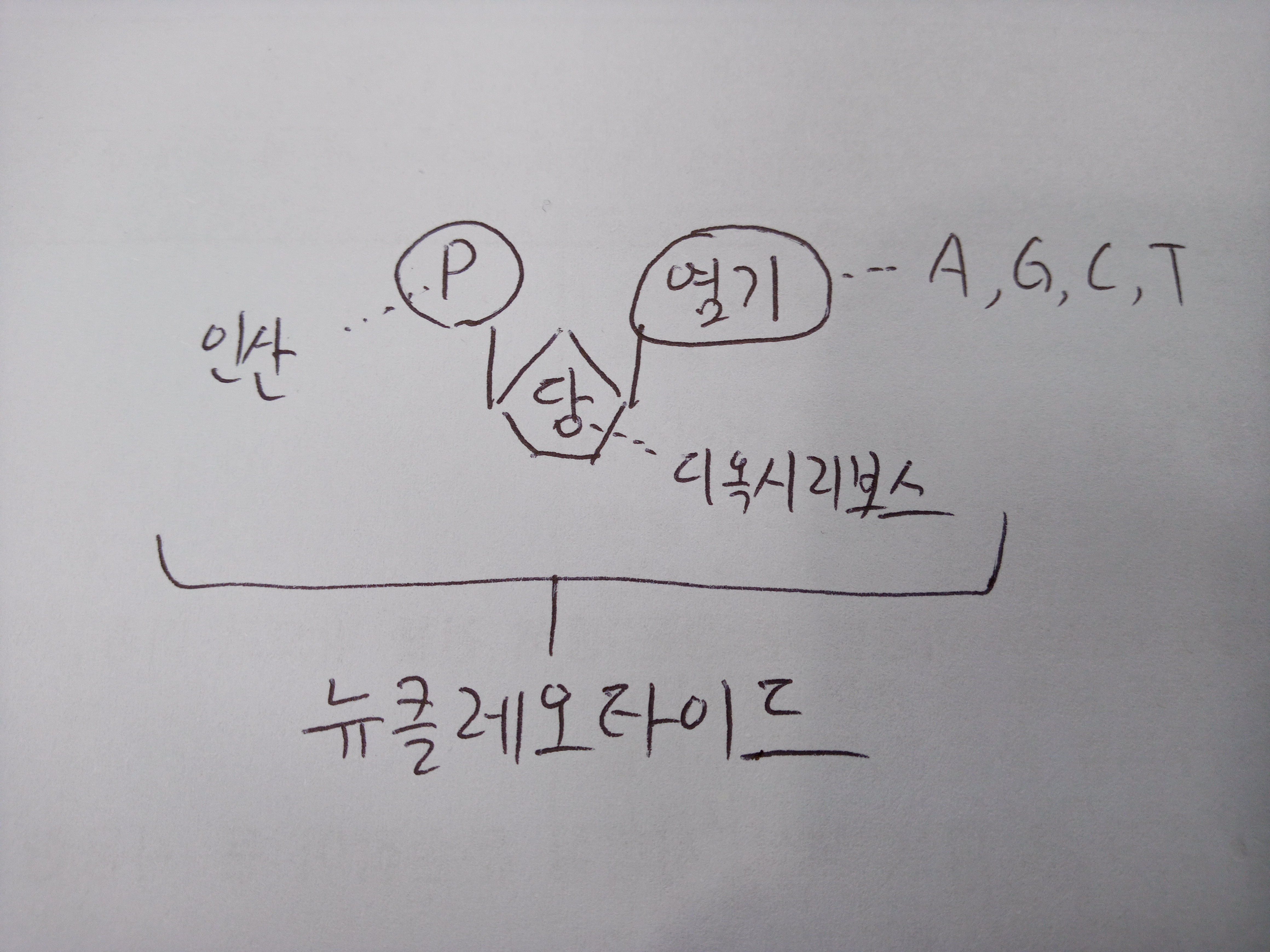 DNA는 나름 큰 고분자 화합물이기 때문에 기본단위를 가지고 있고 그것을 뉴클레오타이드라고 합니다