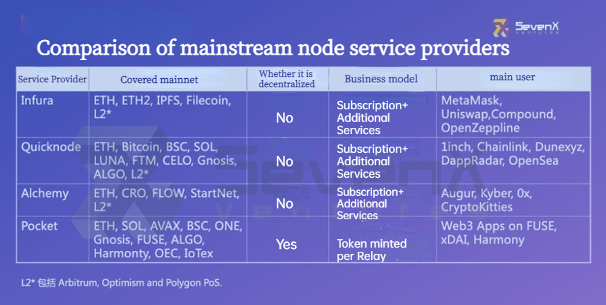 Infura, Quicknode, Alchemy and Pocket are some of the more famous service providers, and developers and entrepreneurs will mainly consider the number of coverage chains, business models and the diversity of additional services when choosing one (are there CDN-like services? Is it possible to access mempool data? Is it possible to provide private nodes?) Infura has experienced node downtime more than once before, and whether it is decentralized is also one of the criteria for people to choose. (In November 2020, Infura was not running the latest version of the Geth client, and some special transactions triggered a bug in this version of the client, and then Infura went down and caused a series of chain reactions: the mainstream trading platform could not charge the ERC-20 Token, MetaMask was not available, etc.)