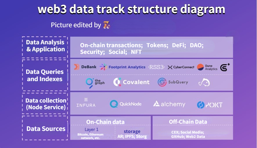 The structure of Web3 data track can be divided into four levels: the bottom level of data sources, the second level of data acquisition, the third level of data query and indexing, and the top level of data analysis and application.