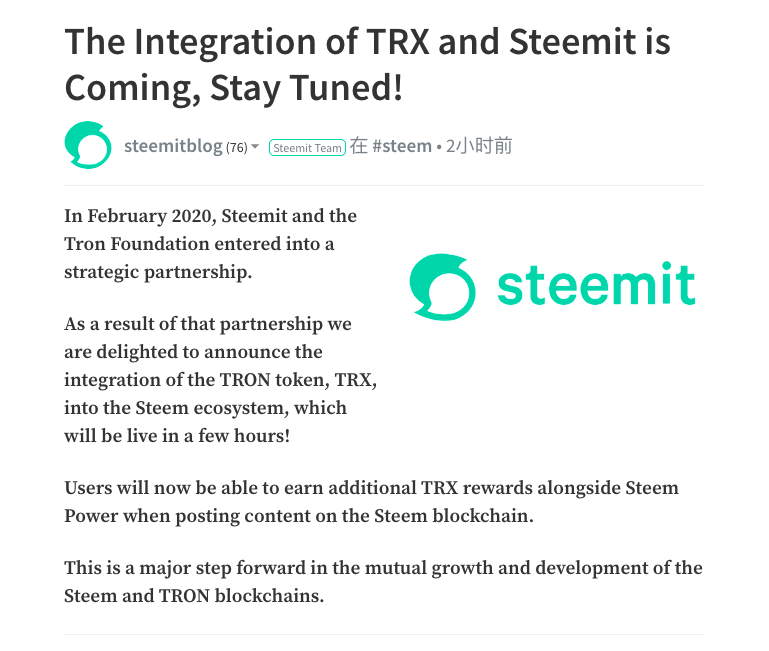 今天,我们获悉Steemit推出《The Integration of TRX and Steemit is Coming, Stay Tuned!》。简单来说,Steem社区用户以后在得到SP的时候,还将1:1得到TRX,这对于Steem社区来说是一个巨大的好消息。我们对此也期待很久,我们还希望Tron社区的用户能进入到Steem中,共同建设Steem。链接:《The Integration of TRX and Steemit is Coming, Stay Tuned!》
