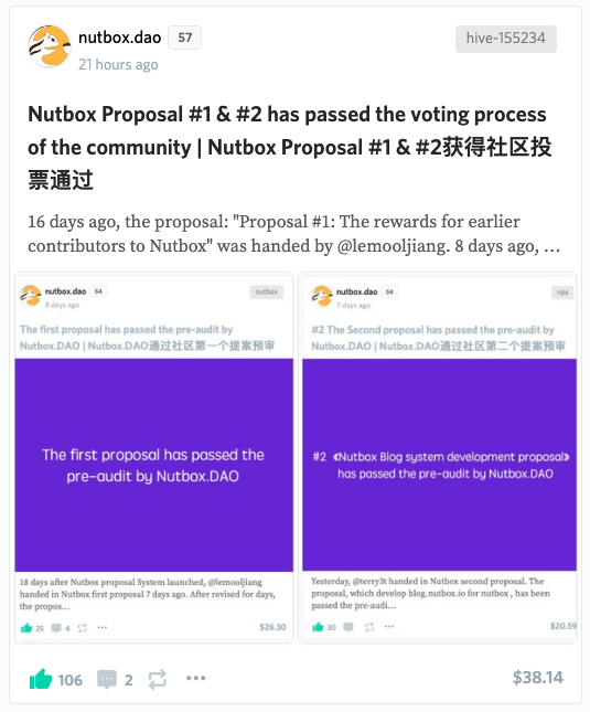 We create a Nutbox curator bot, which upvotes good contents in our community. Meanwhile, we have launched the Nutbox Proposal System,two of three pre-audit proposals have passed the vote process and begin to be executed. They are 《Nutbox Curation Program, for a better Steem future》《Nutbox Proposal #1 & #2 has passed the voting process of the community》《Nutbox Dao governance is online. The procedure of Nutbox proposal is operating》.