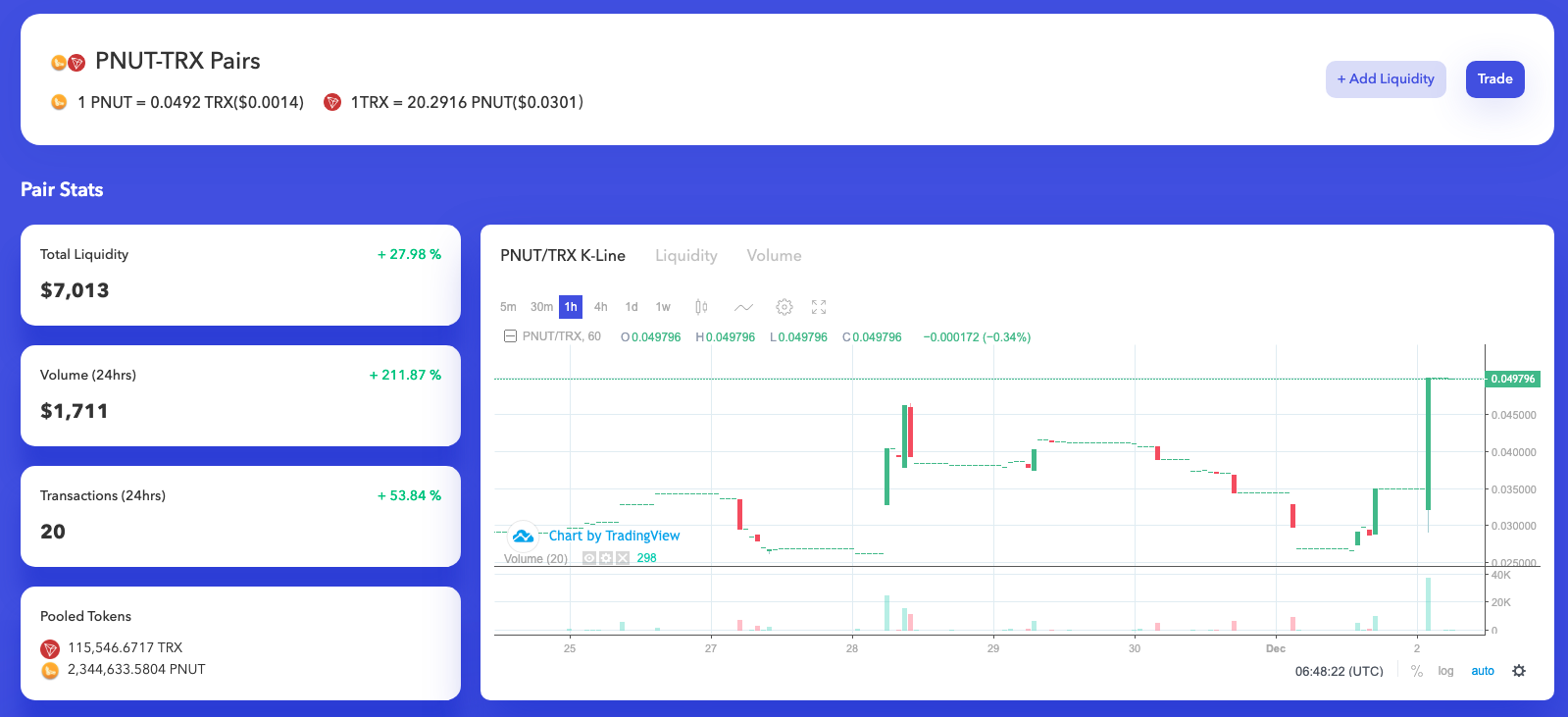 PNUT上线JustSwap后,任何PNUT用户还可以为 PNUT-TRX 交易对提供流动性,赚取交易者的手续费。