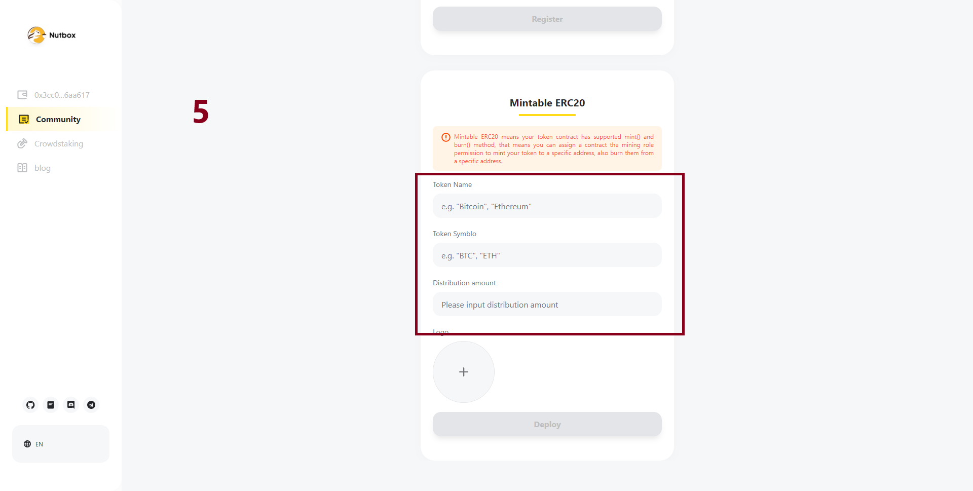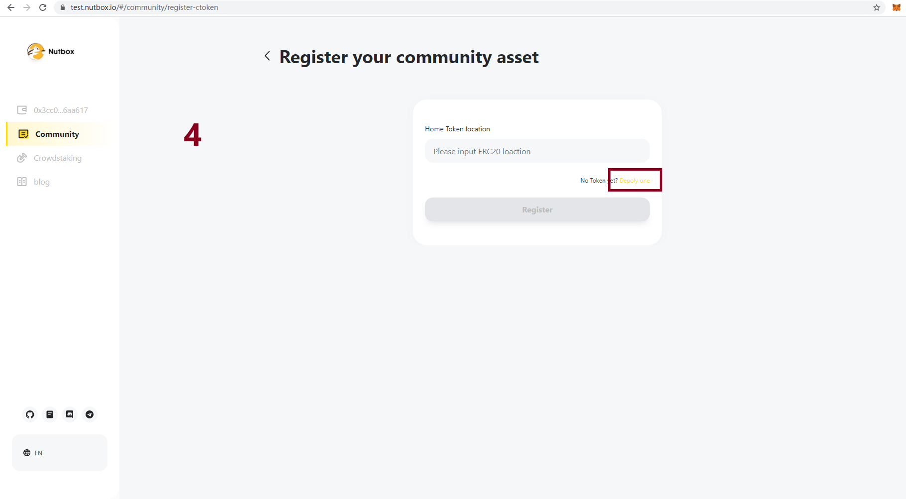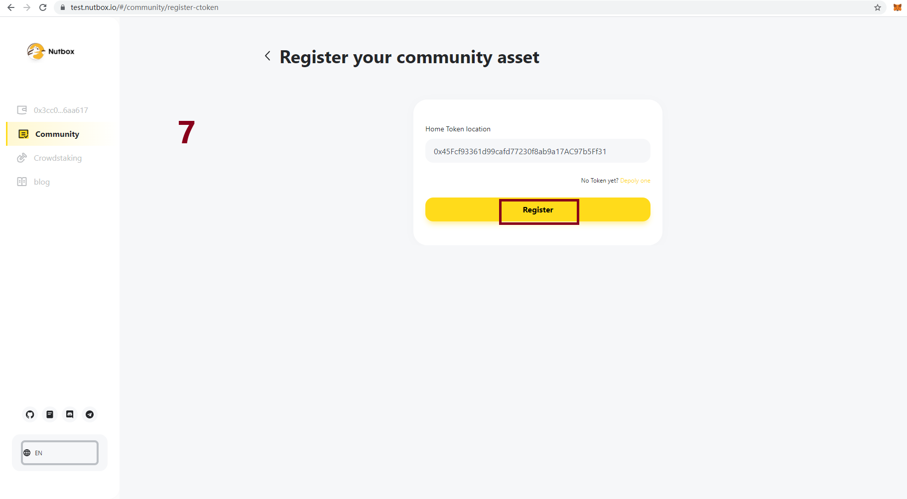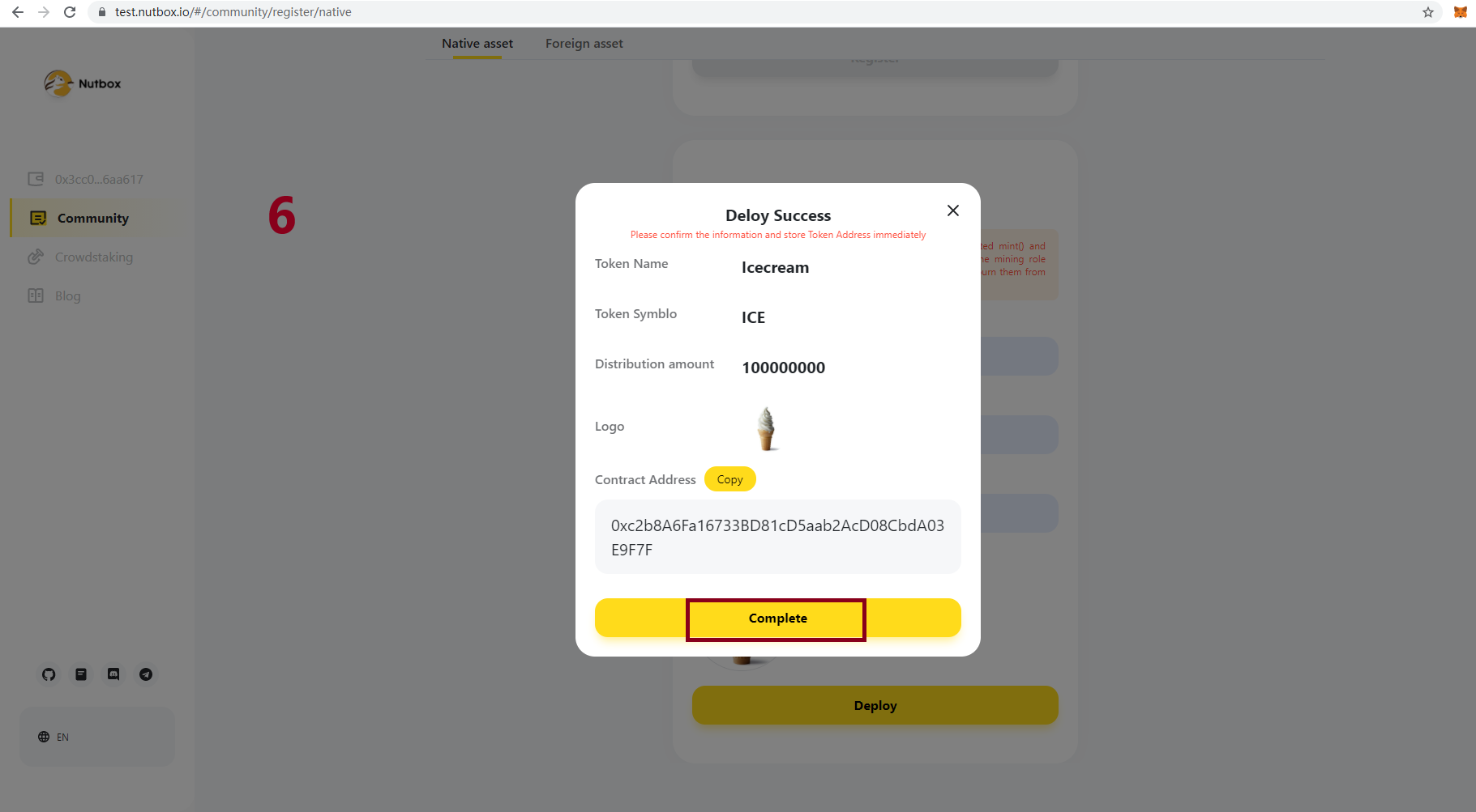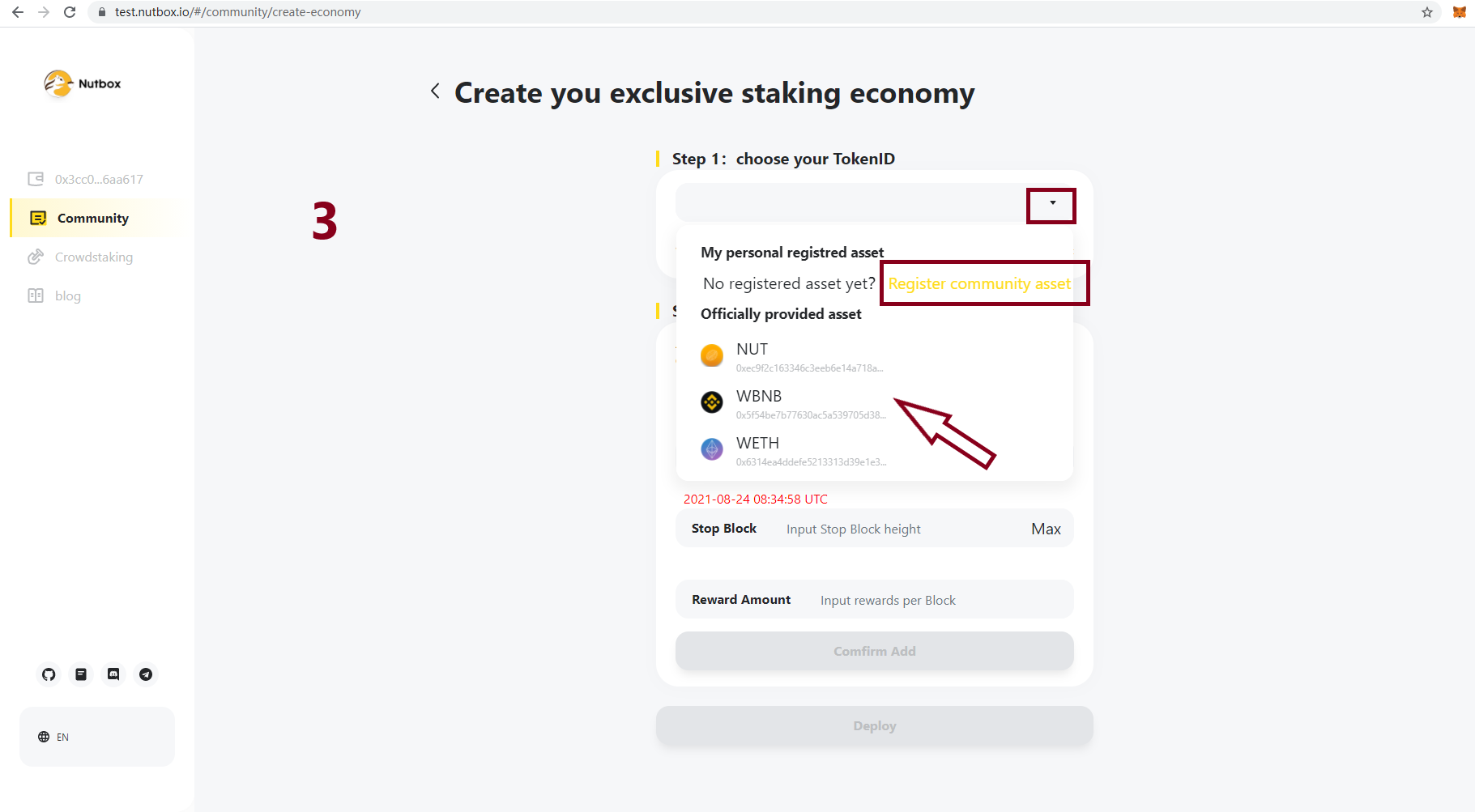 If you have your own community asset just paste your contract address and skip to step 1. If you don't have your own community asset, you could use recommend asset or deploy one. Here are the steps to deploy a new asset and register it in Walnut Network.