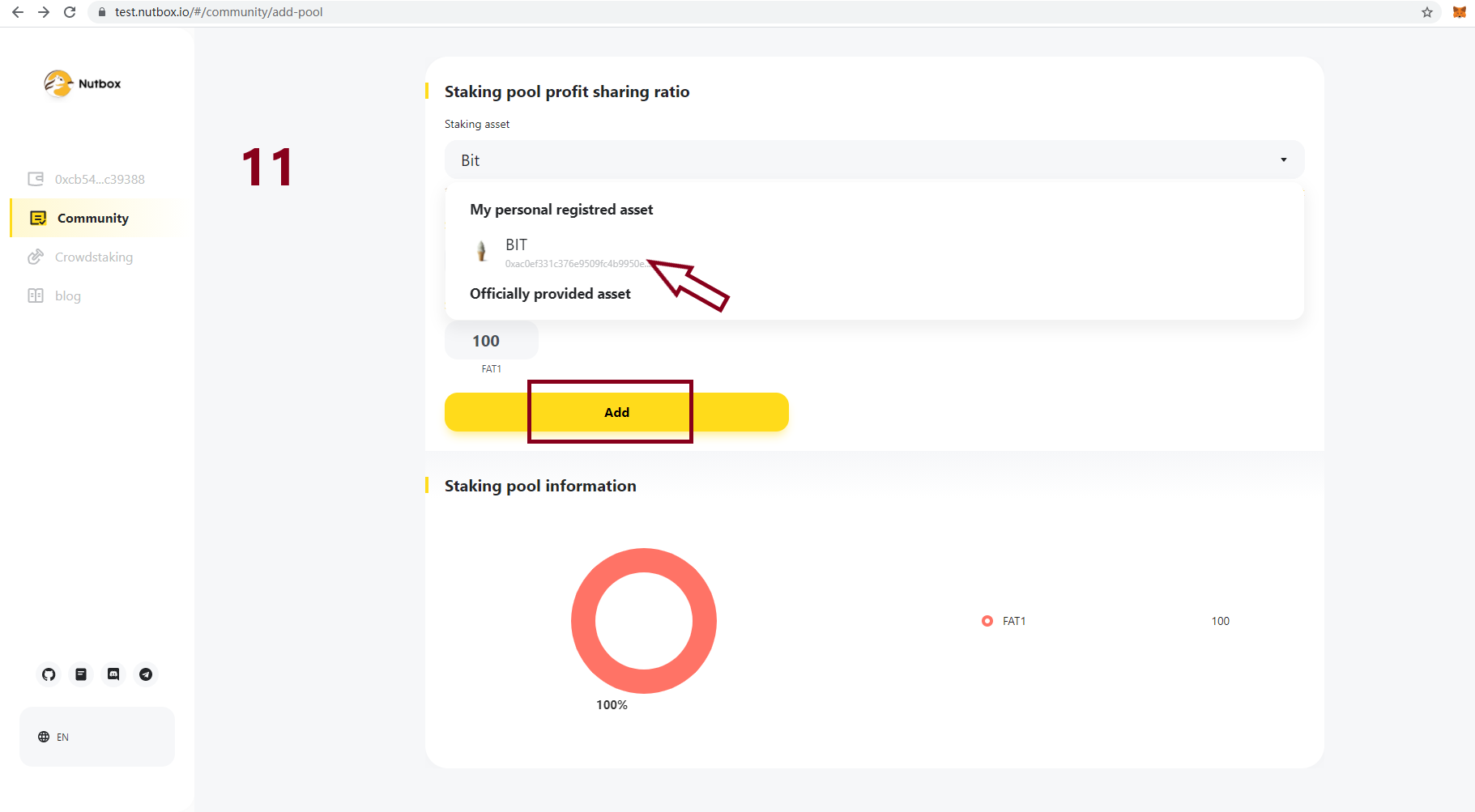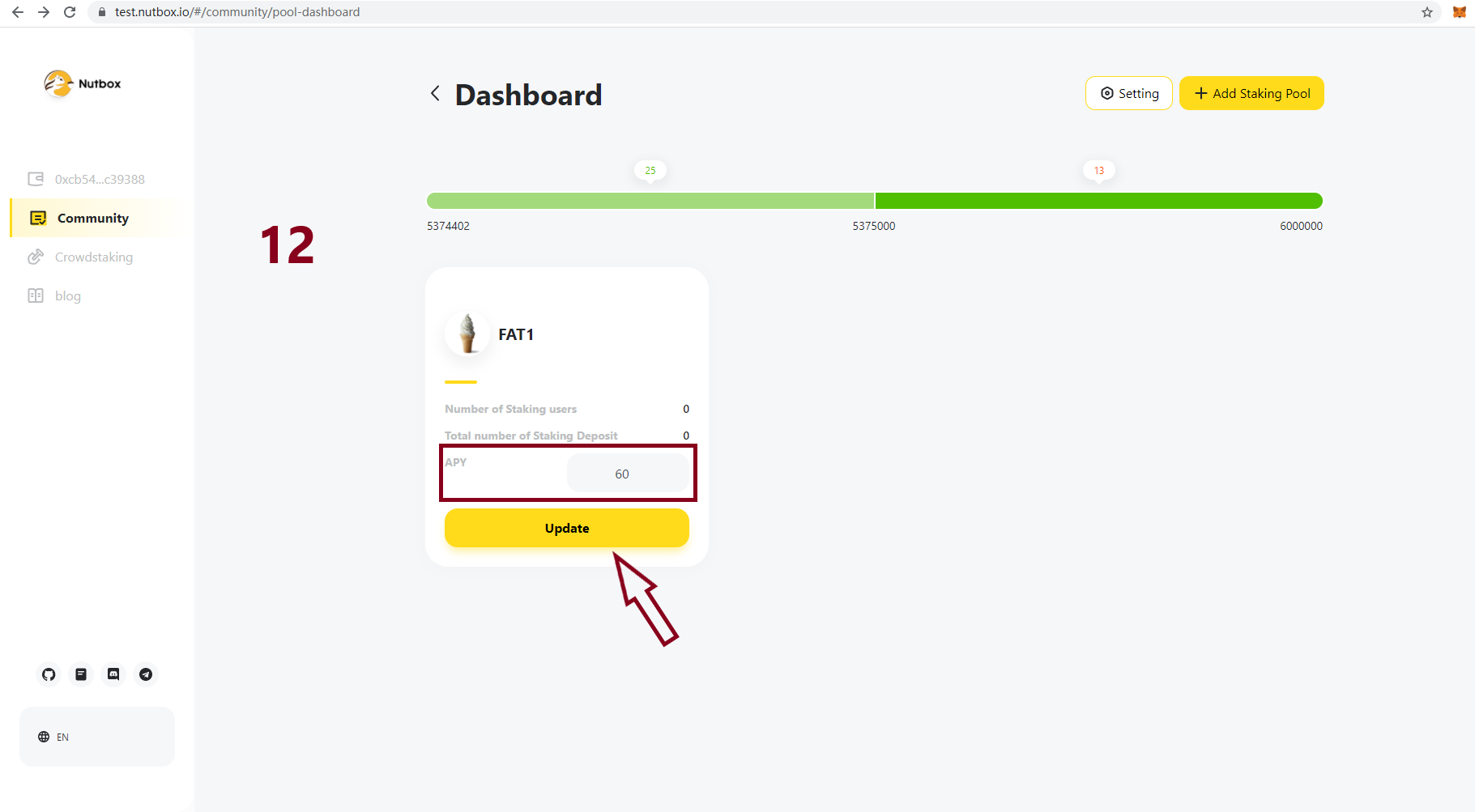 Click Add staking pool button and set your pool profit sharing ratio and APY etc.