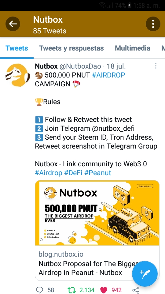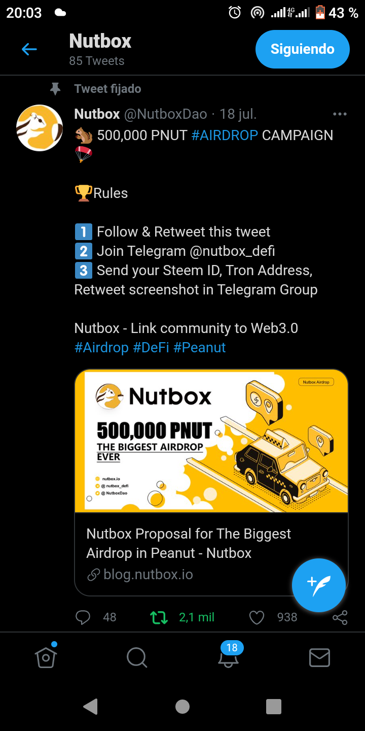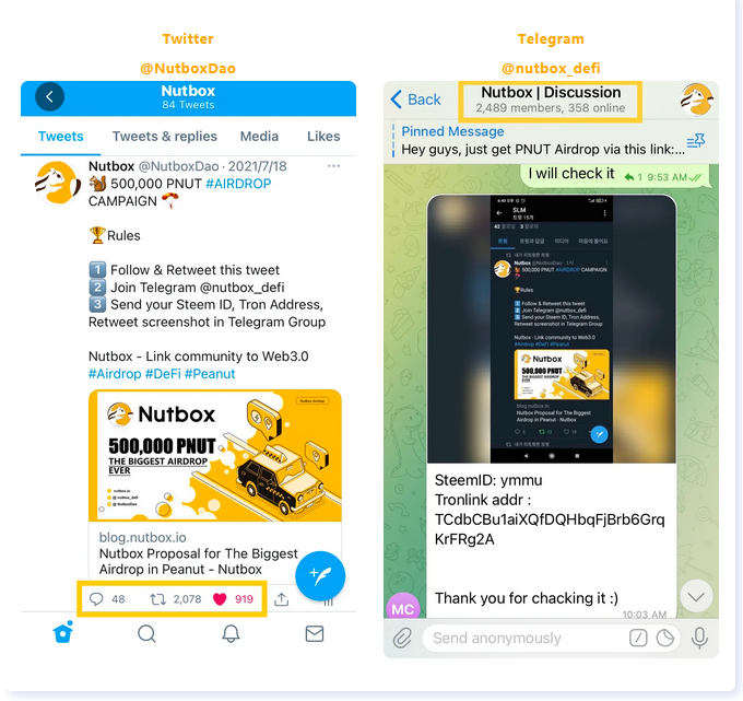 On July 18, Nutbox announced the opening of the largest airdrop event since Peanut launched. After the announcement, Steem community users actively participated. More than 2,400 people joined the Nutbox Telegram group. Nutbox's Twitter followers also exceeded 6,300, and Twitter reposts exceeded 2,000👍🎉