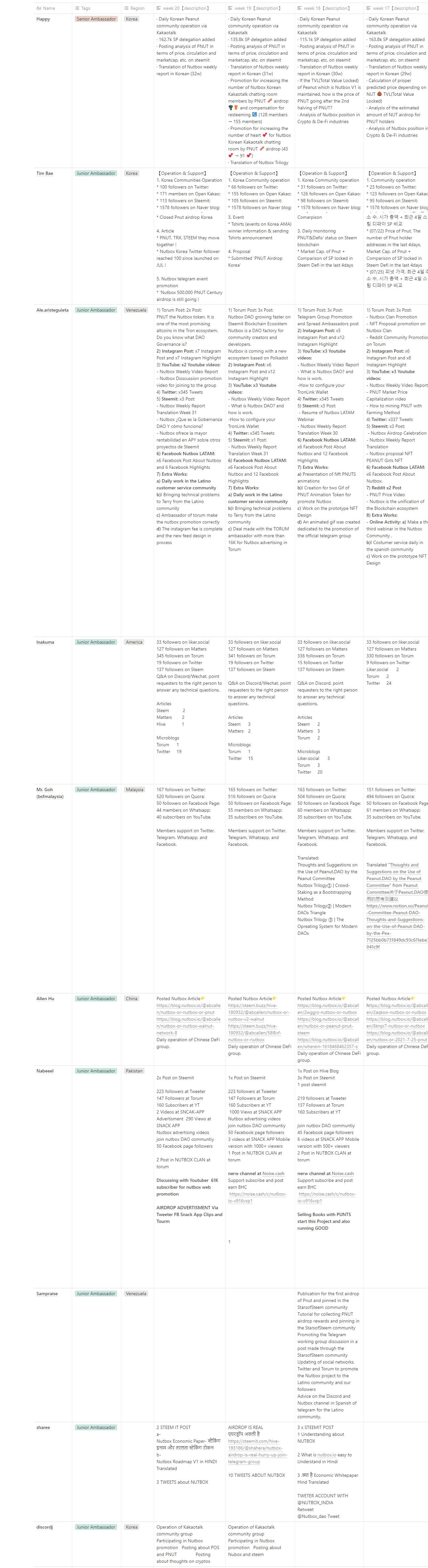 综上,Nutbox感谢各位大使在这段时间的勤劳工作,他们在各个国家和社区为推广Nutbox做出了贡献。