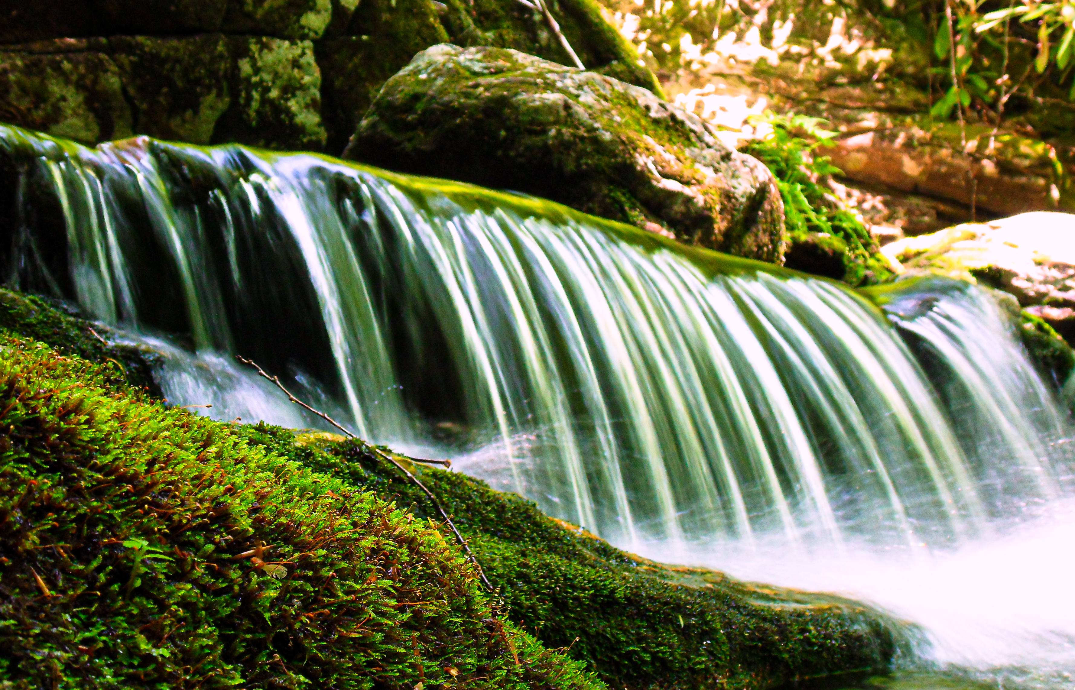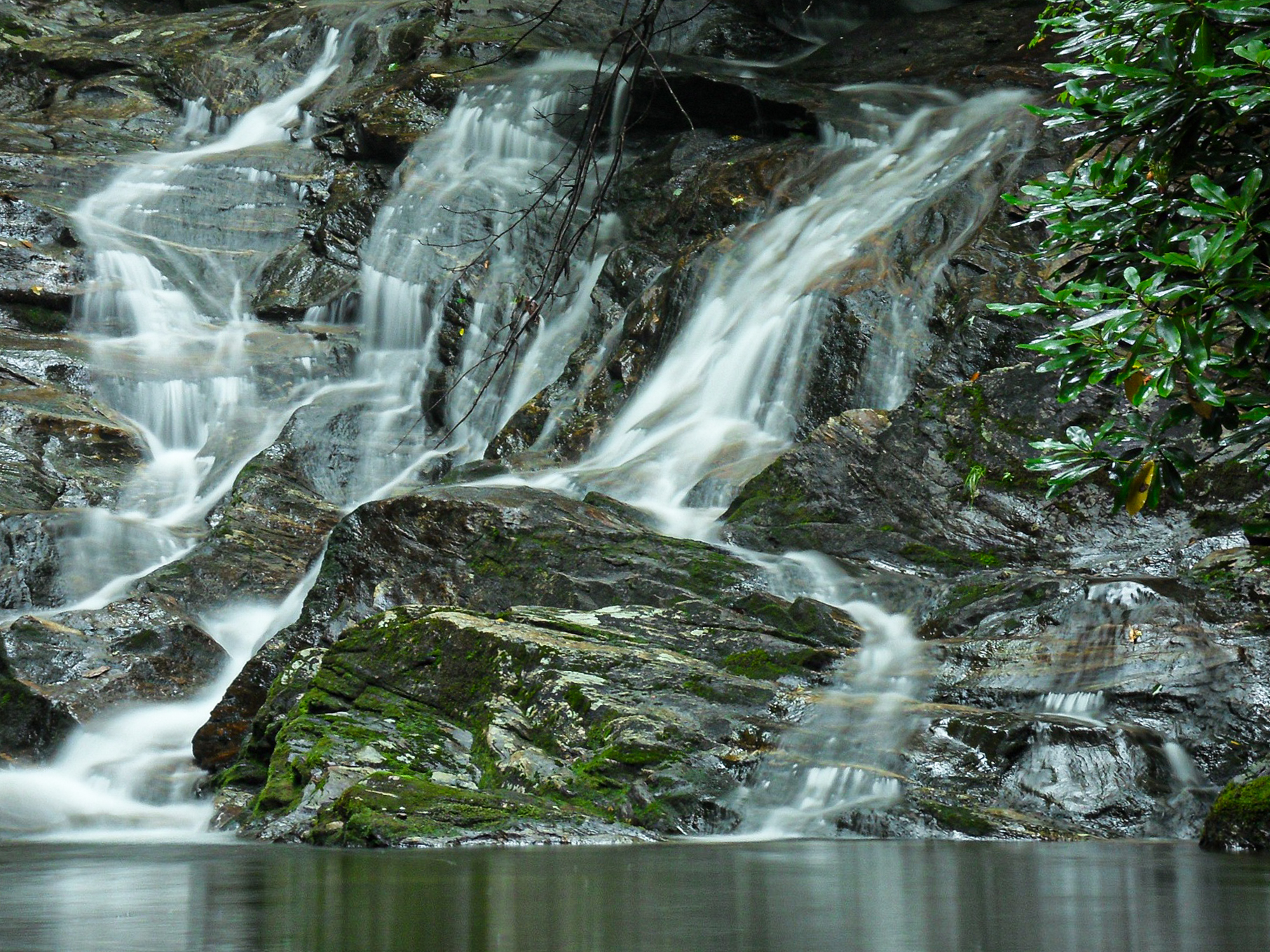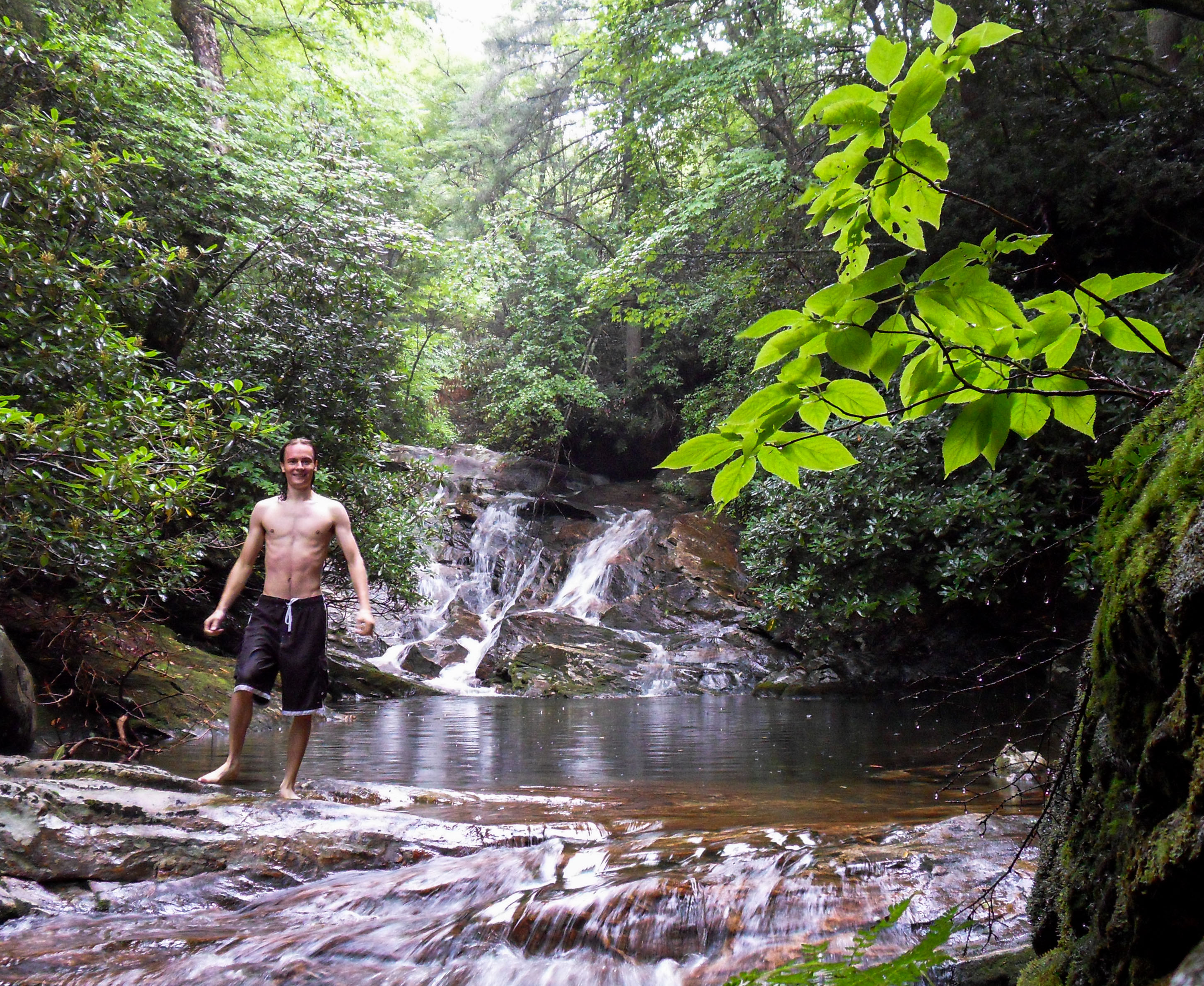 In order to follow the stream we discovered that day, The Dark Prong, explorers must wade, rock hop, swim across deep pools, and climb over the waterfalls to progress toward the top. The steep, overgrown mountain bases on either side of the stream are often impassable, it often isn't a viable option to try to cut through the steep overgrown mountainsides to bypass a stretch of the stream. It isn't easy to take the water route, but it is still much easier than trying to follow the stream on land. This old 2010 photo of that first waterfall is my first attempt at using a tripod and long exposure techniques to show water motion.