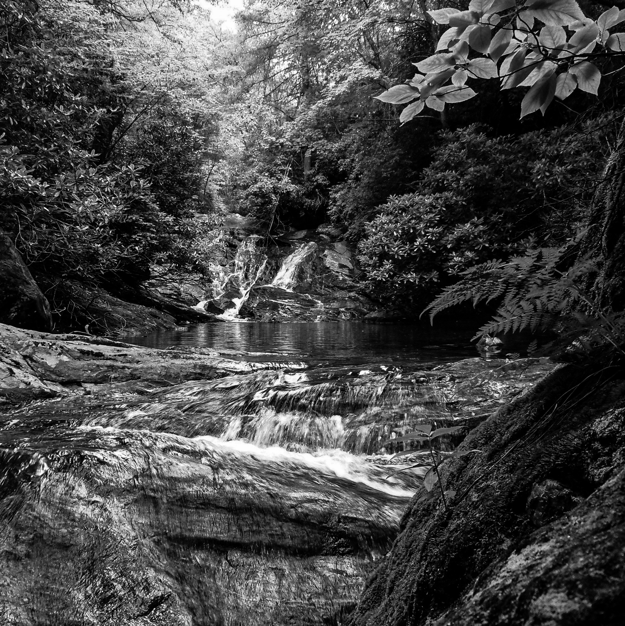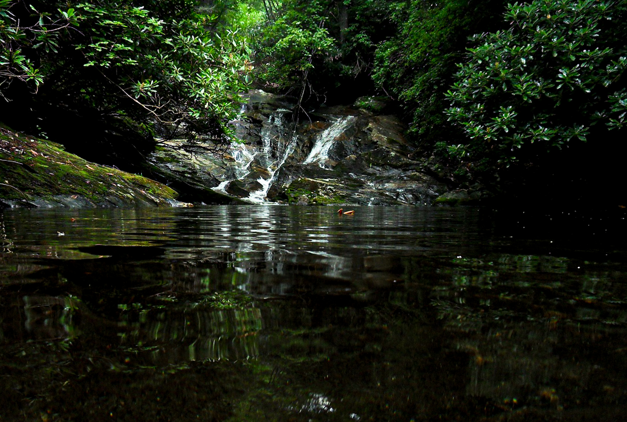 These photos are strongly associated with profound change that took place inside me, in addition to their being my best attempt to remember, show, and praise these "holy" places and experiences from a great transformational period in my life. The trip up the Dark Prong is still a spiritual meditative journey that I take frequently, a visit to a special place that often begins before sunrise and has me lost in the forest well after sunset. It's a spiritual commitment I make, fasting the entire day, no food, occasionally drinking from the clean stream, swimming across deep pools of water while holding my camera in my mouth to keep it above the water a necessary skill just to reach "the top". I suppose it isn't fair to say there's a top, but I follow the stream until I'm so high up in the mountains and the water volume is so low that I can confidently assume that there won't be any more interesting waterfalls further up. To me, that is the top.