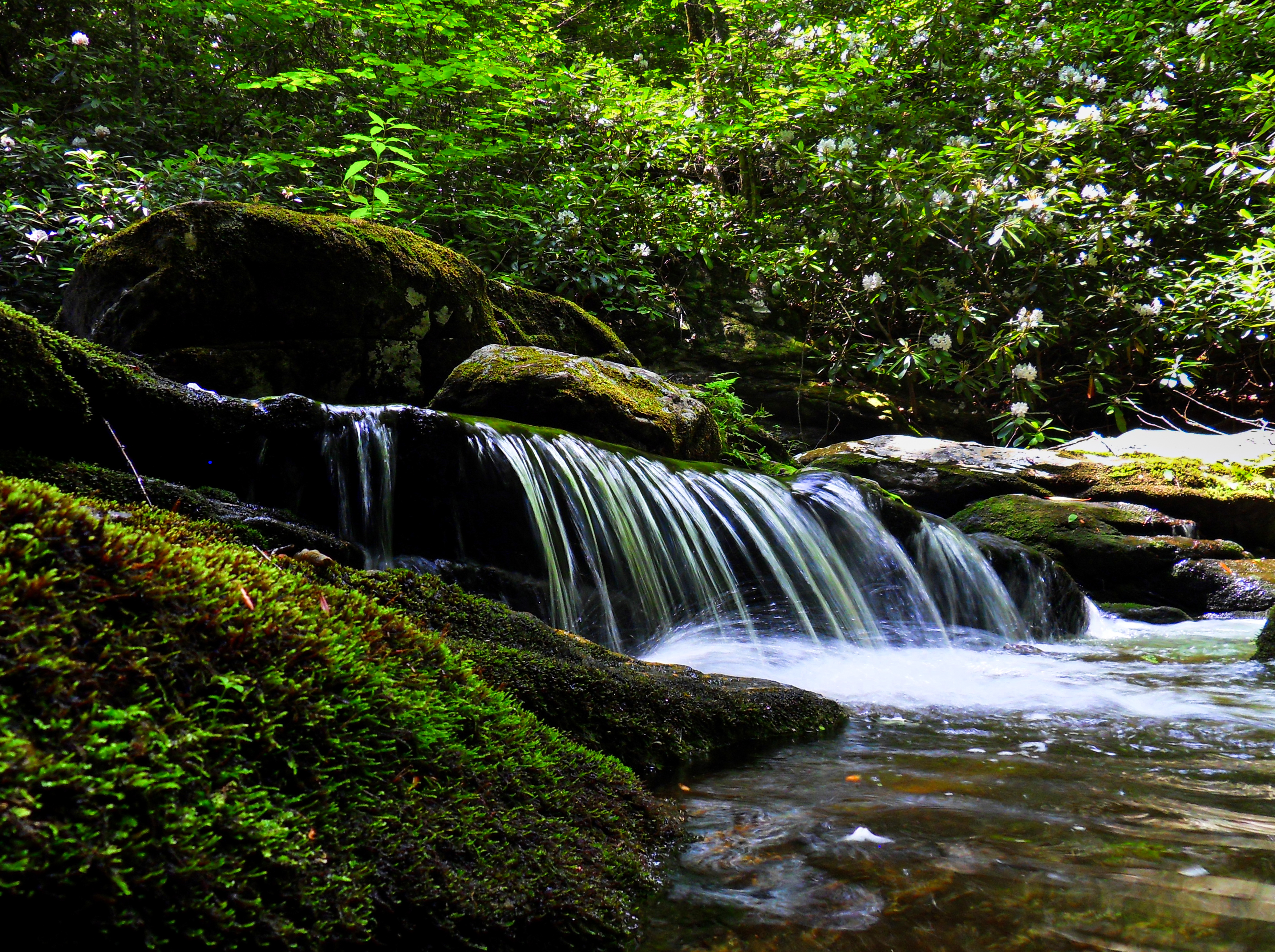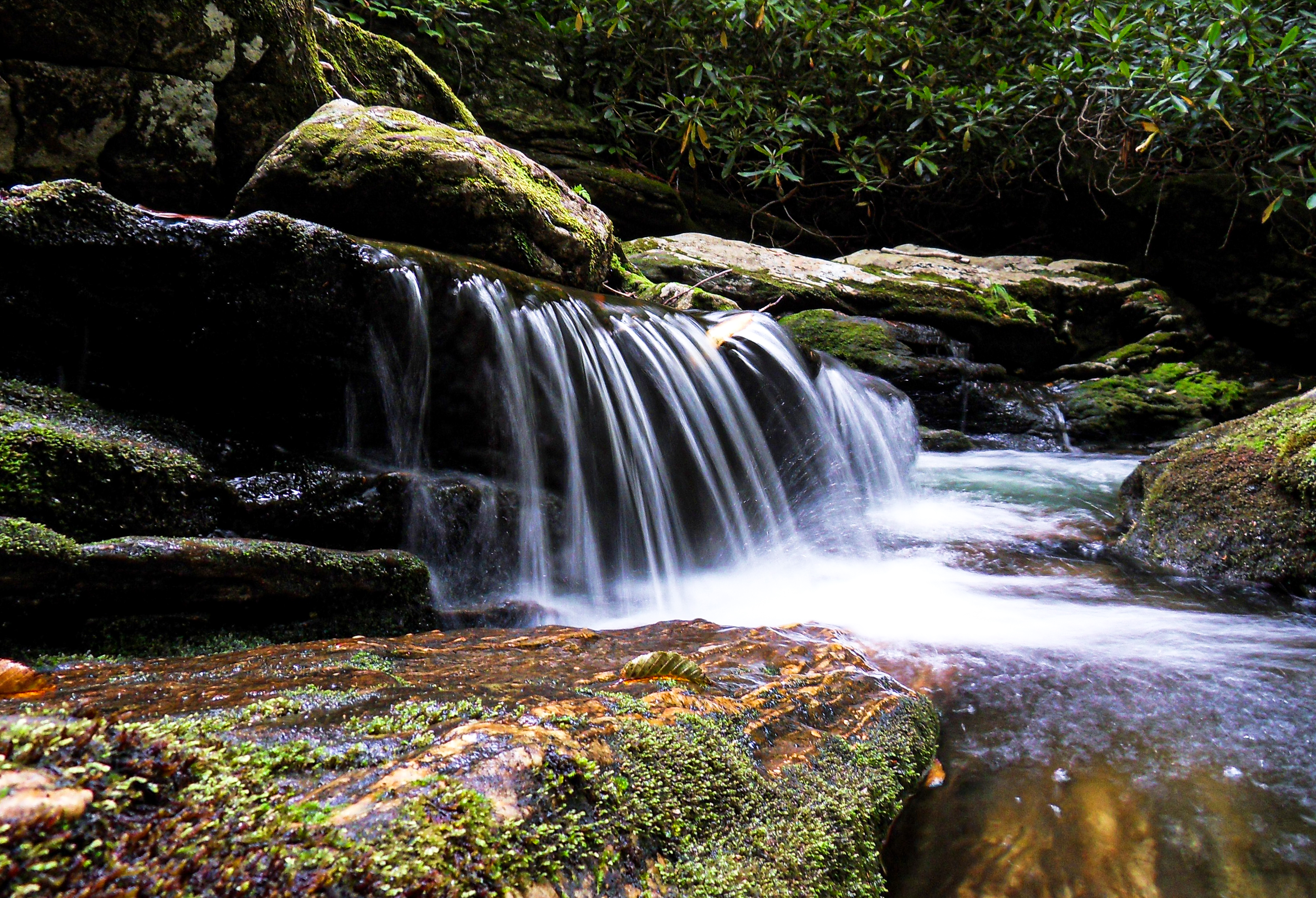 So we're getting closer, the sound is getting louder, and the route we're improvising just keeps throwing curveballs. It's unbelievable how steep and inaccessible it becomes as we get closer. The sound of rushing water starts feeling "just below the next cliff". After a few dead-ends into impasses of thick rhododendron hells, Ernie comments that he wishes he brought the machete, referencing a large blade I had sold and shipped to him years earlier. We keep having to backtrack 10-20 feet (which is a lot of work in this thick brush) to find safer routes scaling the steep sides of the mountain as we get within throwing distance of what must be a waterfall. But it's so damn steep, with so many fallen trees and overgrown rhododendrons that we still can't see it. Well, we sure haven't come all this way to get within feet of it, still unable to see the waterfall, just to turn around and whack our way back up. One more cliff, down the slick rocks, as smaller tributary streams running over the ground around us soak into our shoes and cause us to slip and slide, with the two of us often climbing or hanging on to the thick rhododendron branches to keep from sliding uncontrollably into the unexplored ravine below us. It isn't until we reach the stream itself that we have a view of a waterfall, but we make it, and there are waterfalls.