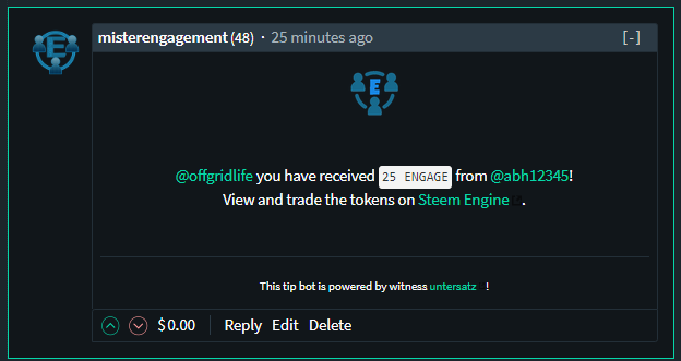 ENGAGE tokens were issued by @abh12345 and are distributed by a bot created by witness @untersatz.