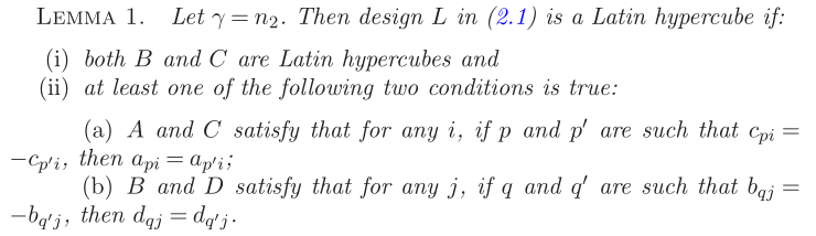 C.Devon Lin, Derek Bingham, Randy R. Sitter and Boxin Tang 联合署名在 The Annals of Statistics 上(2010 Vol.38, No.3,1460-1477) 上发表了一篇论文,题为《A new and flexible method for constructing designs for computer experiments》。 该文是 Lin 的博士论文(Lin (2008))的缩略版。 该文描述了一些新颖的思想和方法,使能从现有较小运行数的正交拉丁超立方构造出较大的正交拉丁超立方(OLHD)。 检验其发布的 OLHD,符合作者的预期。然而,文章关于堆叠法的理论叙述存在一些值得讨论的问题,以致某些结果是不能接受的。 本文就堆叠法的某些问题与作者讨论,并在附录中给出自己的建议。2. 关于Lin 的定理 1