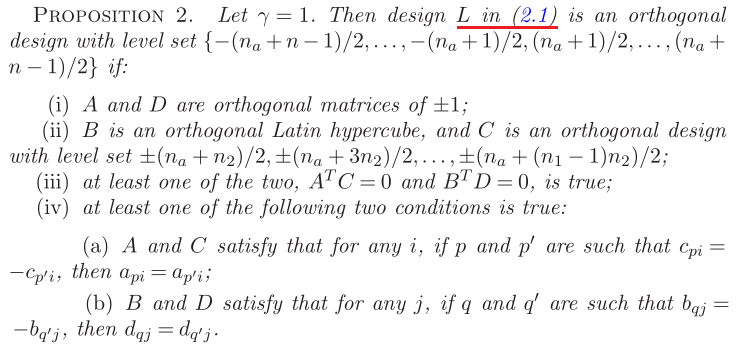 Lin's Definition 2.1(Lin (2008)) A Latin hypercube is said to be orthogonal if all pairs of its columns have zero correlation (p.12)