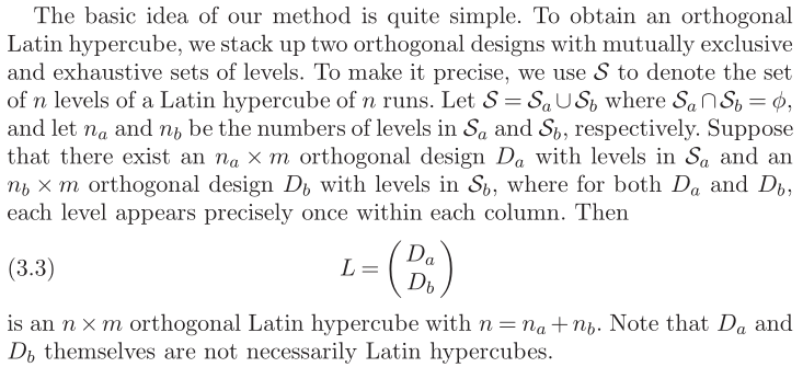 作者不论证OLHD 的可堆叠性,从定理 1 导出了两个堆叠法。这样操作得到的一定是 OLHD 不需要证明? 是不是满足这一条件就一定能得到 OLHD?而且“ Da and Da themselves are not necessarily Latin hypercubes.” 我不敢相信。
