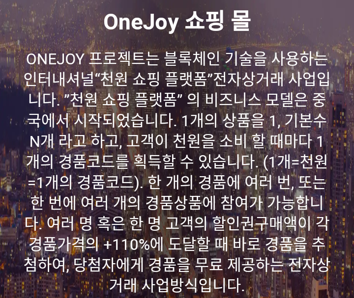 ONEJOY 프로젝트는 블록체인 기술을 사용하는 인터내셔널“천원쇼핑몰” 전자상거래 사업입니다.