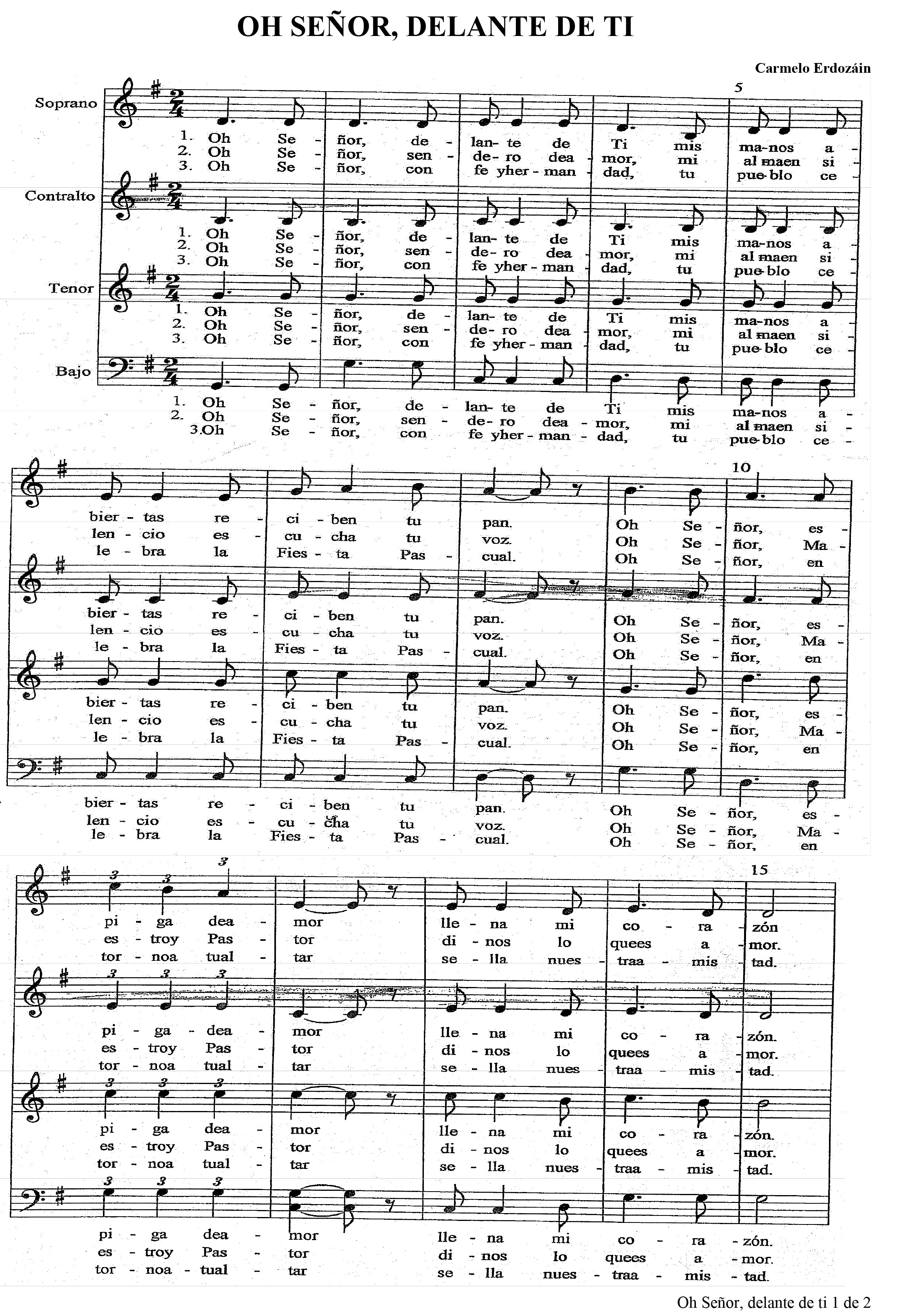 This theme is for me a beautiful Work of Art, a magnificent composition in the Key of G Major , of the Grand Master Carmelo Erdozain , one of my favorite Liturgical composers. The work is composed of 3 stanzas and a chorus on a Cyclic structure. This work maintains a theme Eucharistic, Christ-centered , invites the contemplation of the Eucharistic Mystery, to prayer at the moment of communion at Mass.