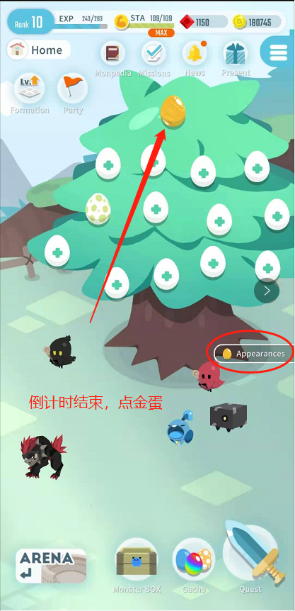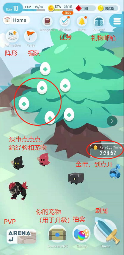 (1)主界面右边的金蛋记住,倒计时结束就可以在树上领了,会给rare级别的宠物,同时完成每日任务,获取50个宝石