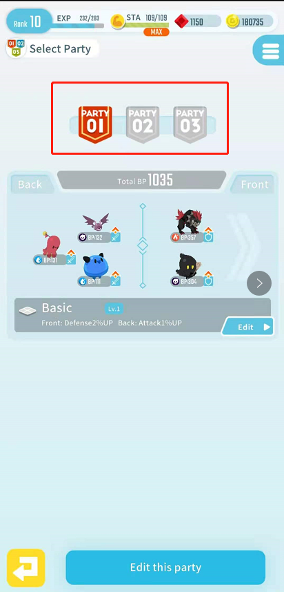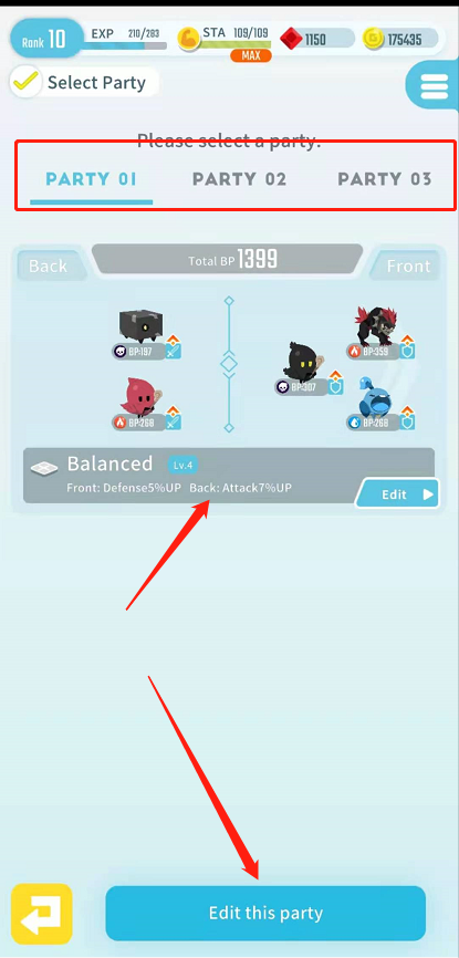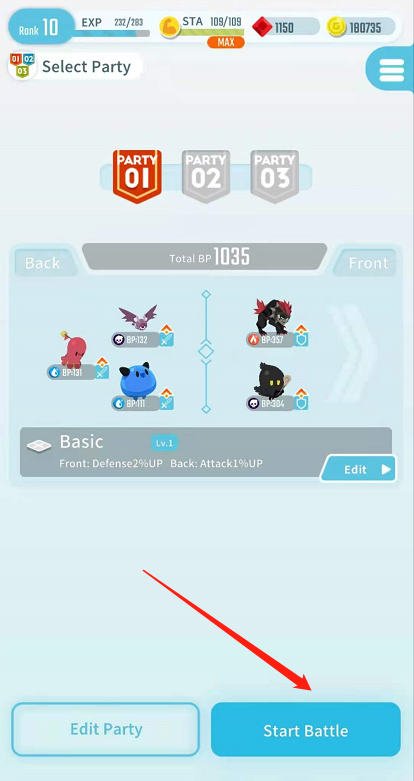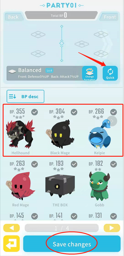 点击edit进入编队,我们直接在上面选择quick,自动完成编队匹配最高BP(战力),如果想更换宠物,双击队伍里面的宠物卸下,再在下面选择别的宠物打钩就行,编队完记得保存