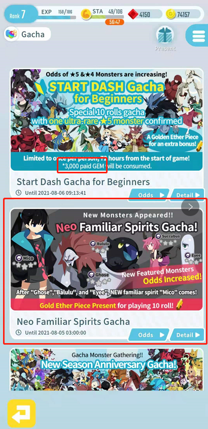 然后我们进到抽奖界面,注意下做任务送的宝石是free gem,充值的宝石是paid gem,池子的抽取会有要求,所以我们只能抽中间那个池子,操作不赘述