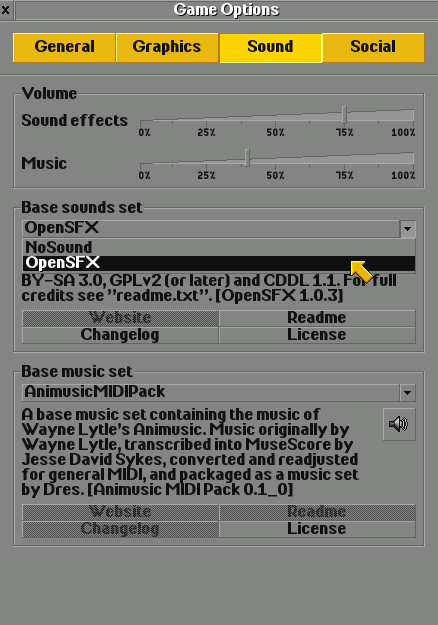 Onder de tabbladen “Graphics” en “Sound” selecteer je de zojuist gedownloade bestanden. ( Zie foto’s)