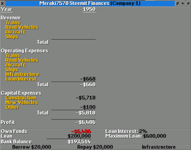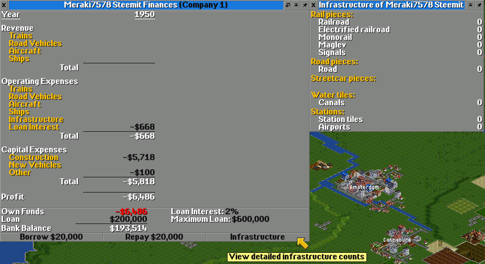 Als je op deze knop drukt, opent er een nieuw venster waar je kunt zien hoeveel treinrails, wegen, waterwegen, enzovoort. je bezit.