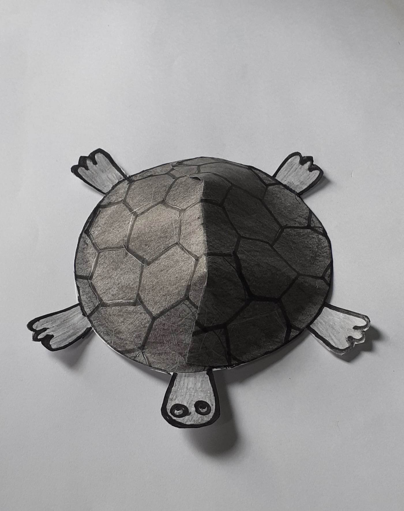 এবার অতিরিক্ত সাদা কাগজ কাচি দিয়ে কেটে নিতে হবে। দেখতে যাতে সুন্দর লাগে,সেজন্য পা ও মাথা কাল রং এর সাইন পেন দিয়ে দাগ দিয়ে নিতে হবে। আর তা হলেই তৈরি হয়ে যাবে কাগজ দিয়ে কচ্ছপ তৈরি।