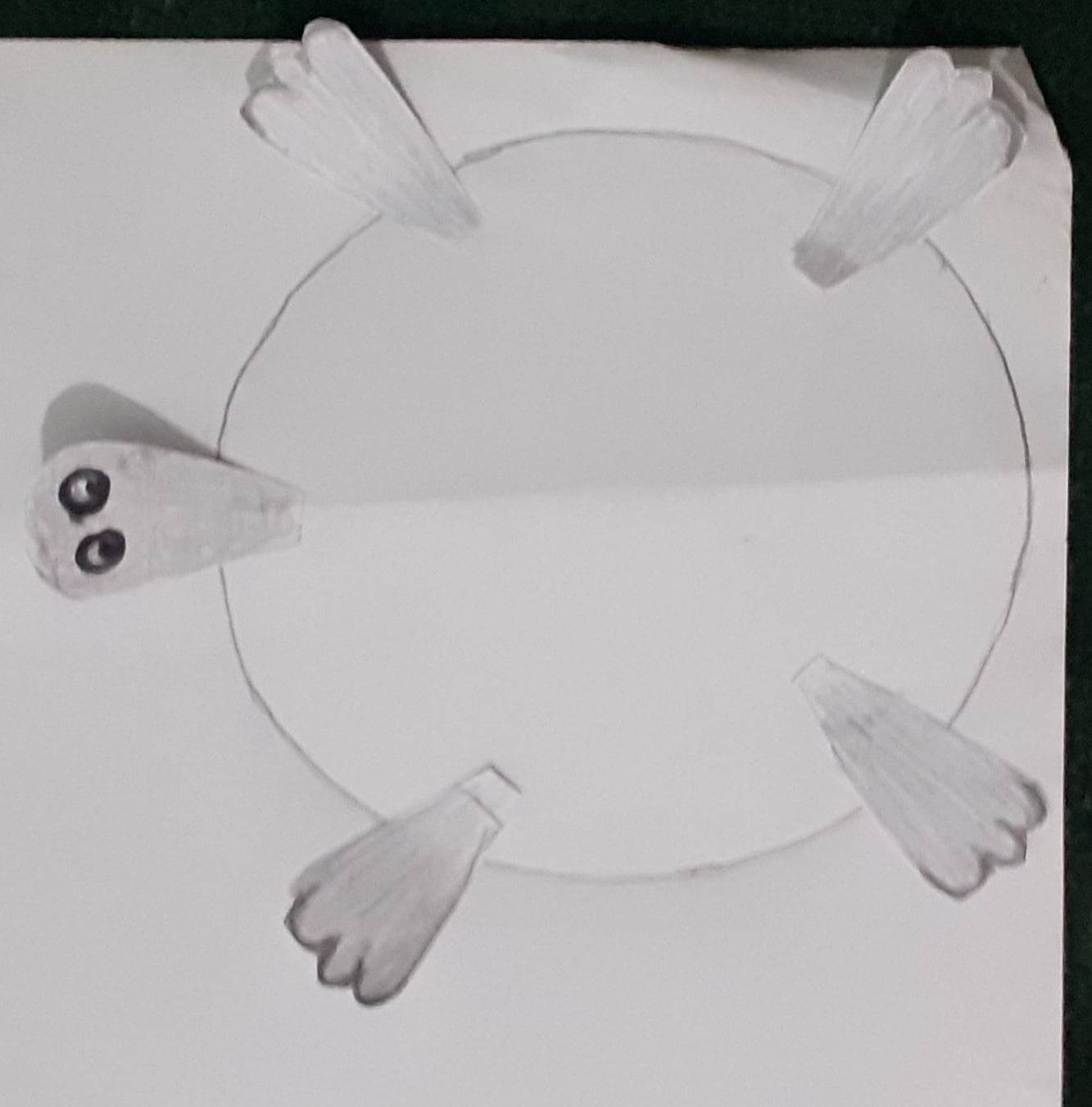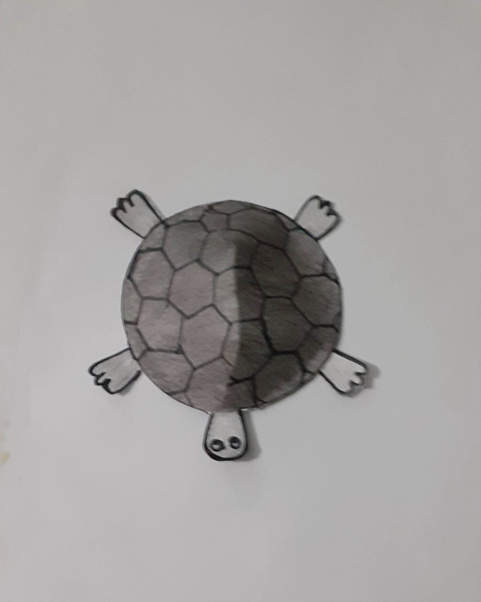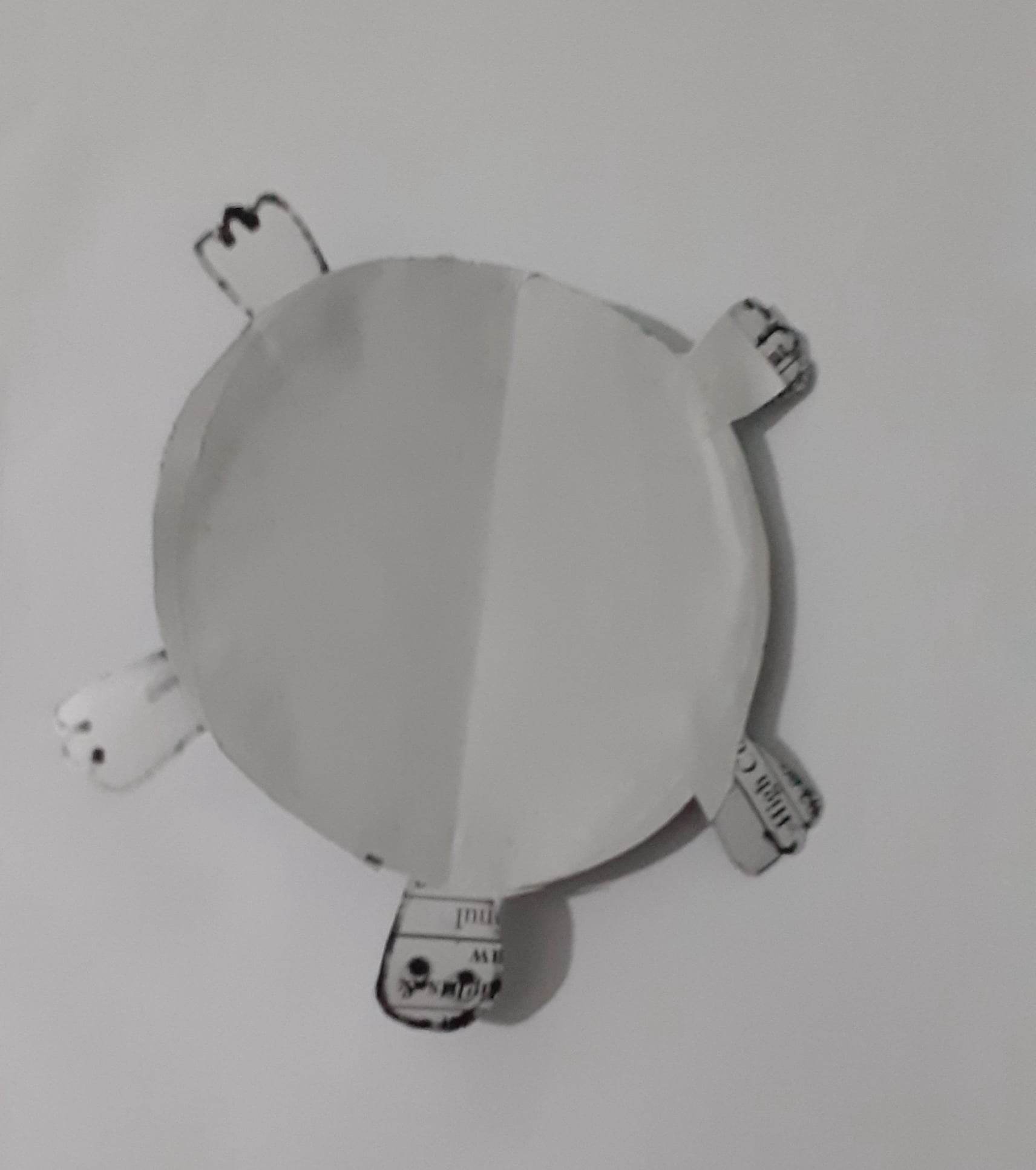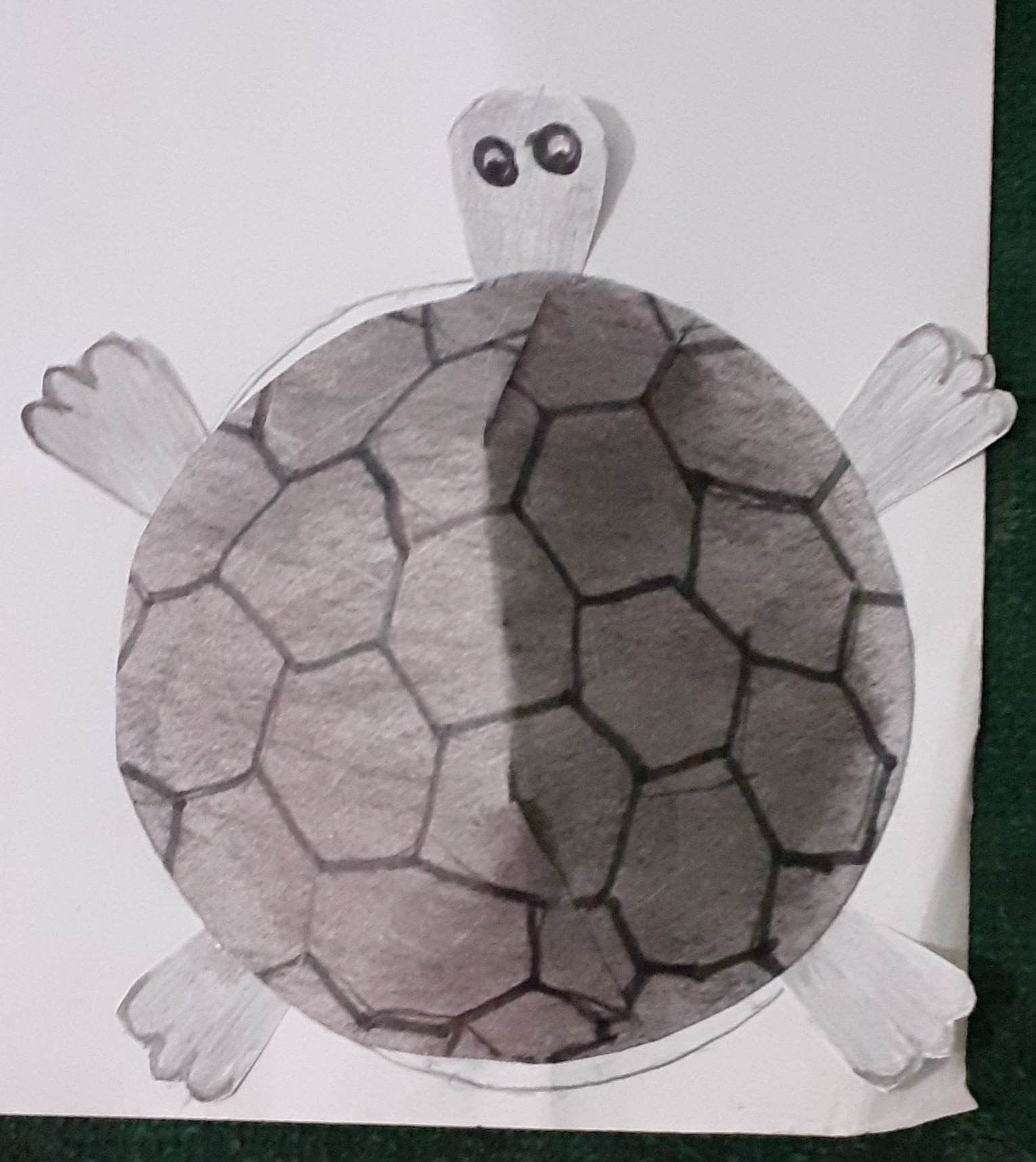 এবার সাদা কাগজে আর একটি বৃত্ত একে নিতে হবে। ছবির মত করে সেই বৃত্তের সাথে গাম দিয়ে আগে থেকে তৈরি করে রাখা কচ্ছপের পা ও মাথা লাগিয়ে নিতে হবে।