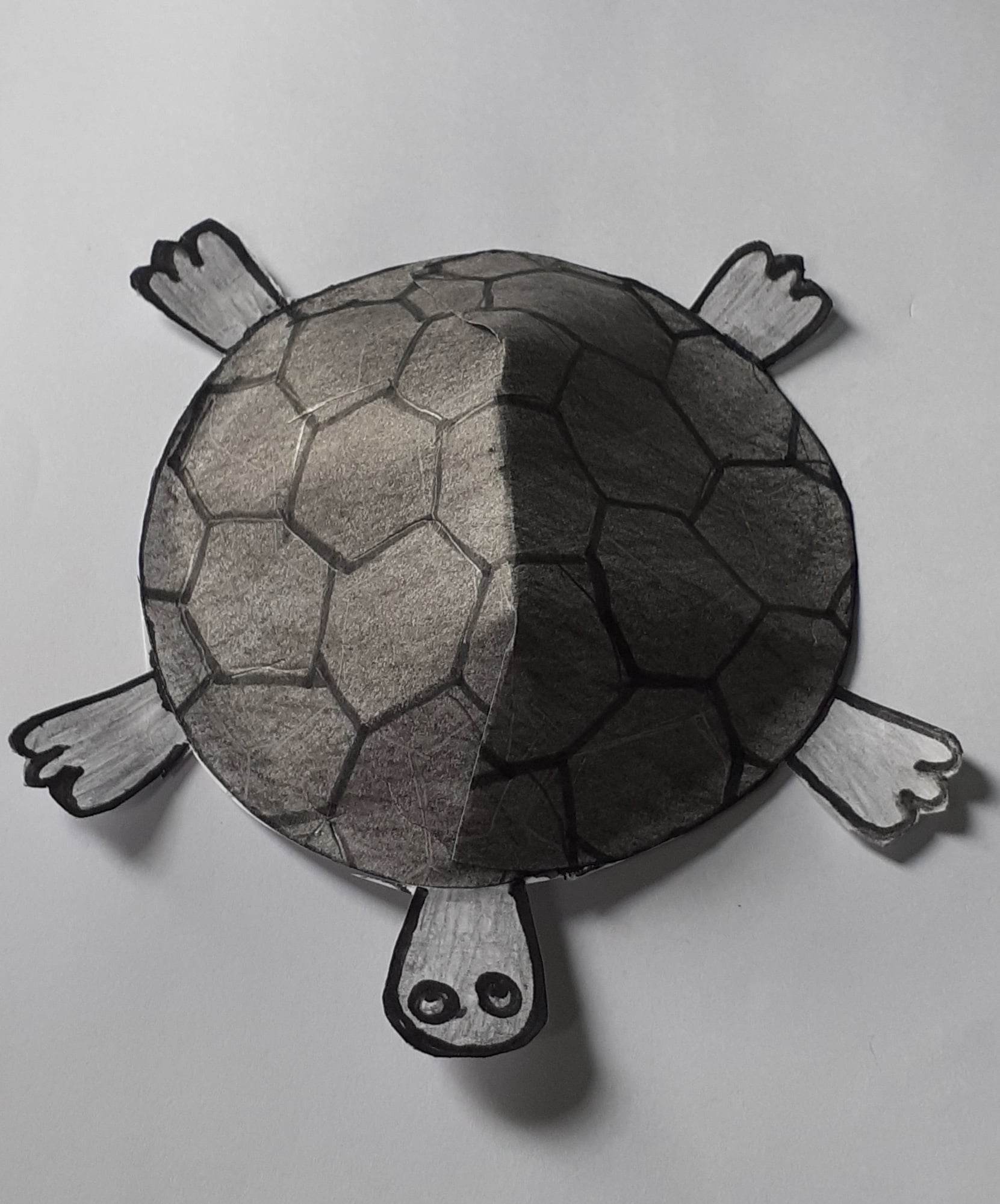 কাল রং করা কাগজটিকে কচ্ছপের শরীরের মতো করার জন্য সাইন পেন দিয়ে ছবির মতো করে একে নিতে হবে।