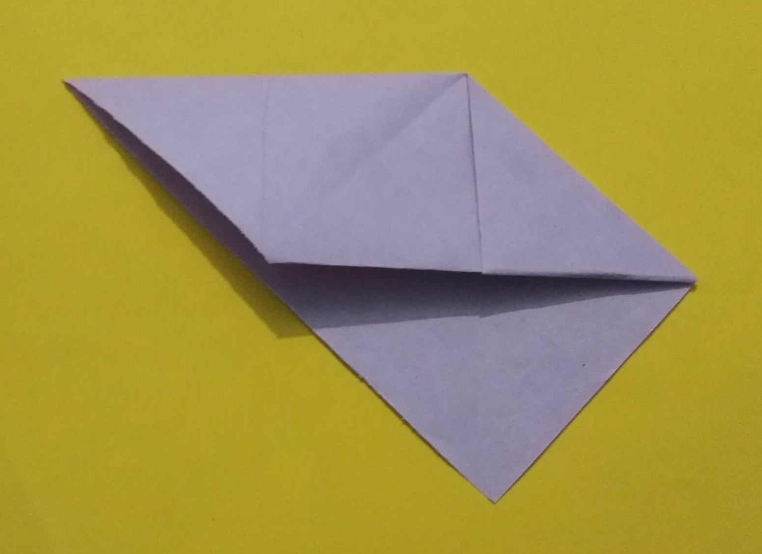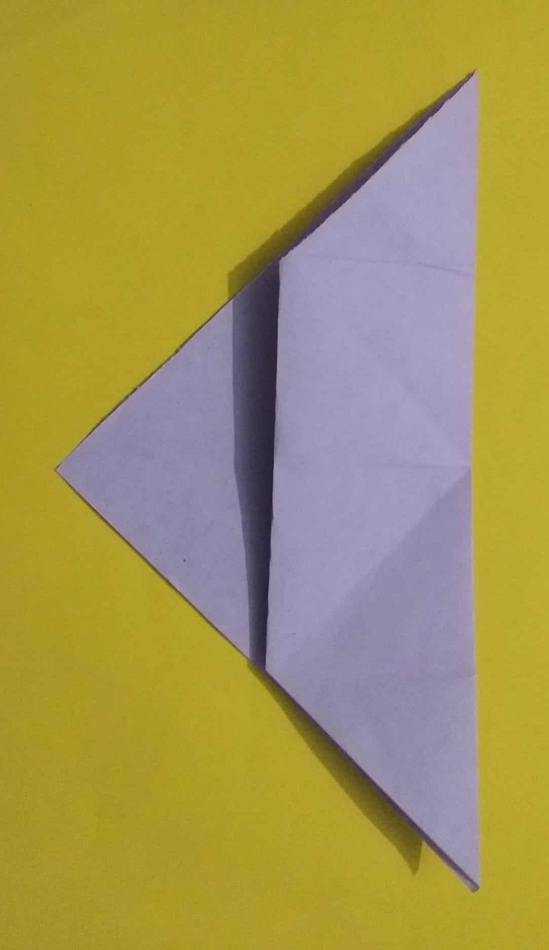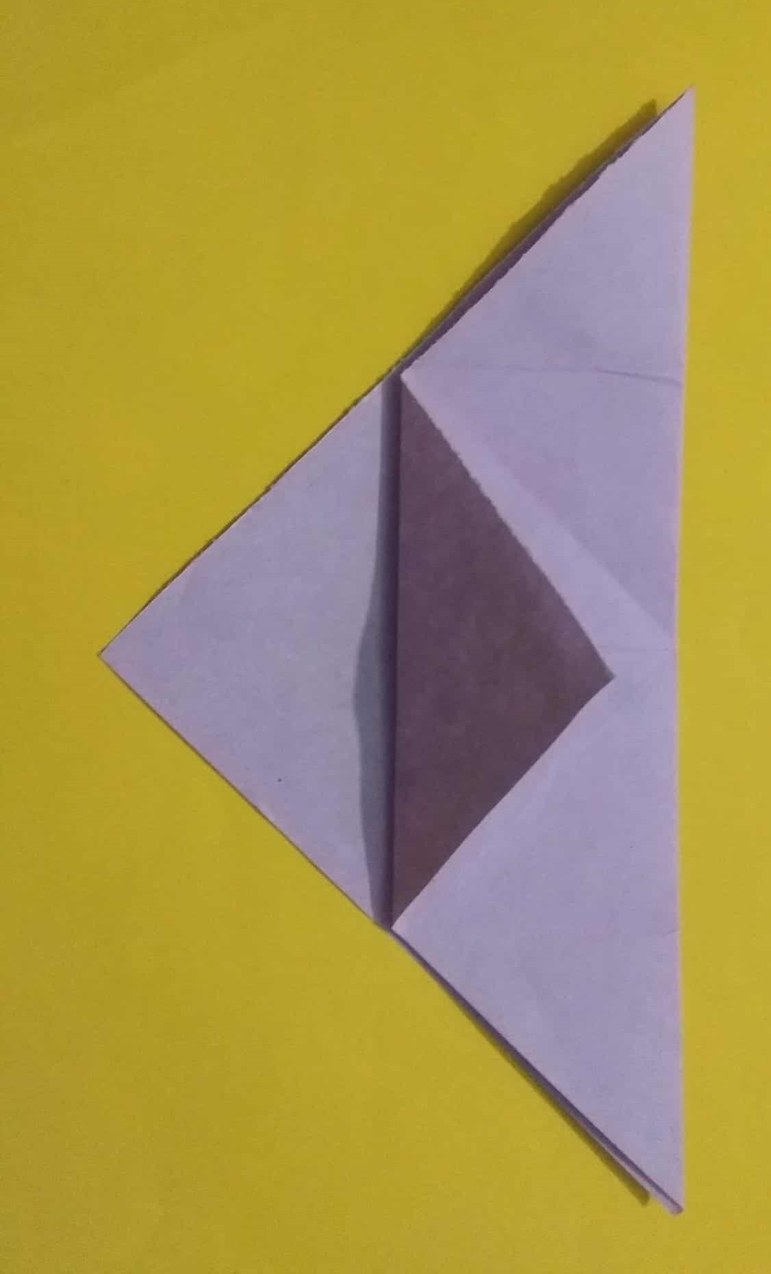 উপরের দিকে কোনা অংশটি নিচের দিকের ভাঁজ বরাবর ভাঁজ করে নিয়েছি। দাগের অংশটি কাগজের ভাঁজে ঢুকিয়ে দিয়েছি।