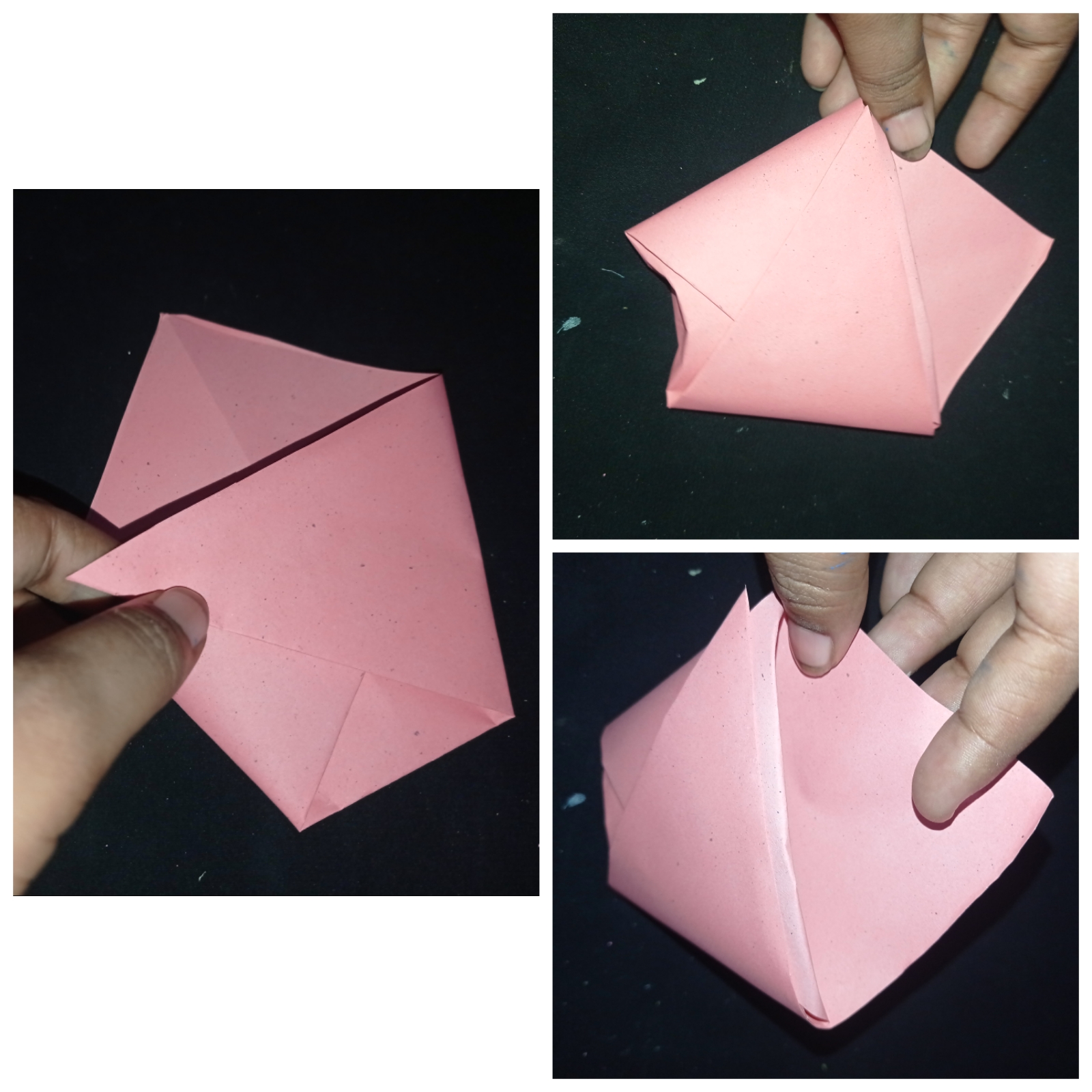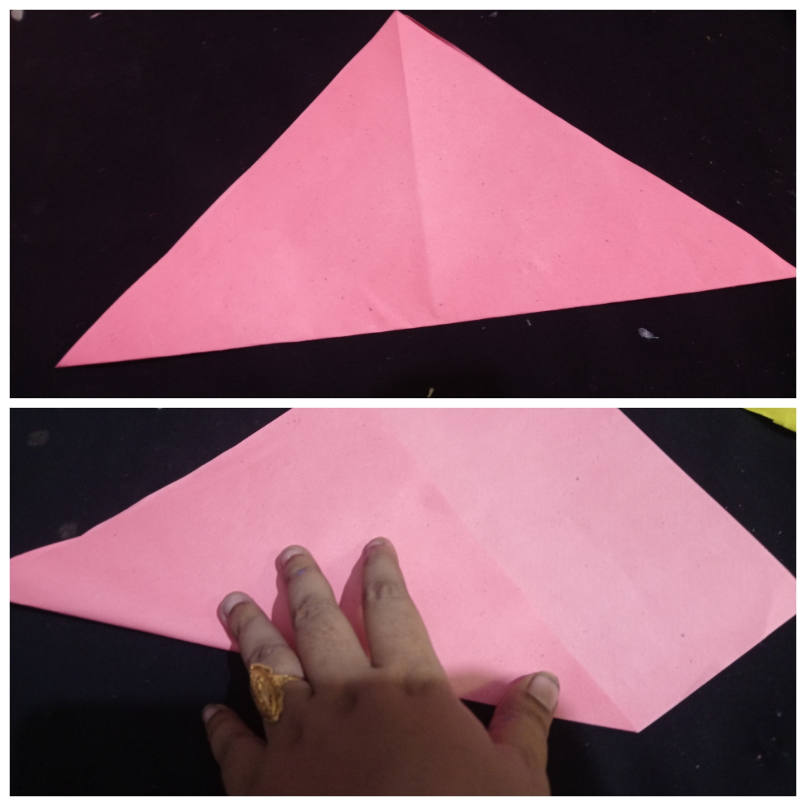 এরপর আমি লাল কালারের একটা কাগজ নিয়ে চারপাশে সমান ভাবে কেটে নিলাম। এরপর কোনা করে ভাঁজ করে নিলাম।